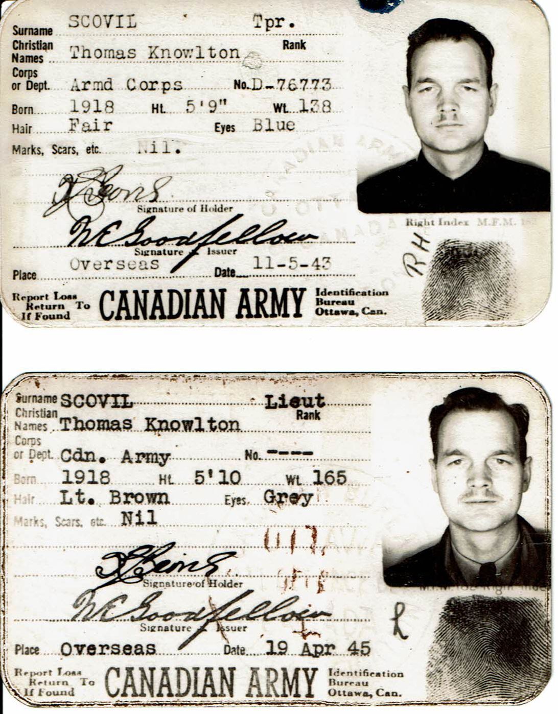 Two Canadian Army identification cards issued to Trooper (and later to Lieutenant) Thomas Knowlton Scovil of The Royal Montreal Regiment. The first card was issued on November 11, 1943, and the second card was issued on April 19, 1945.Relationships
