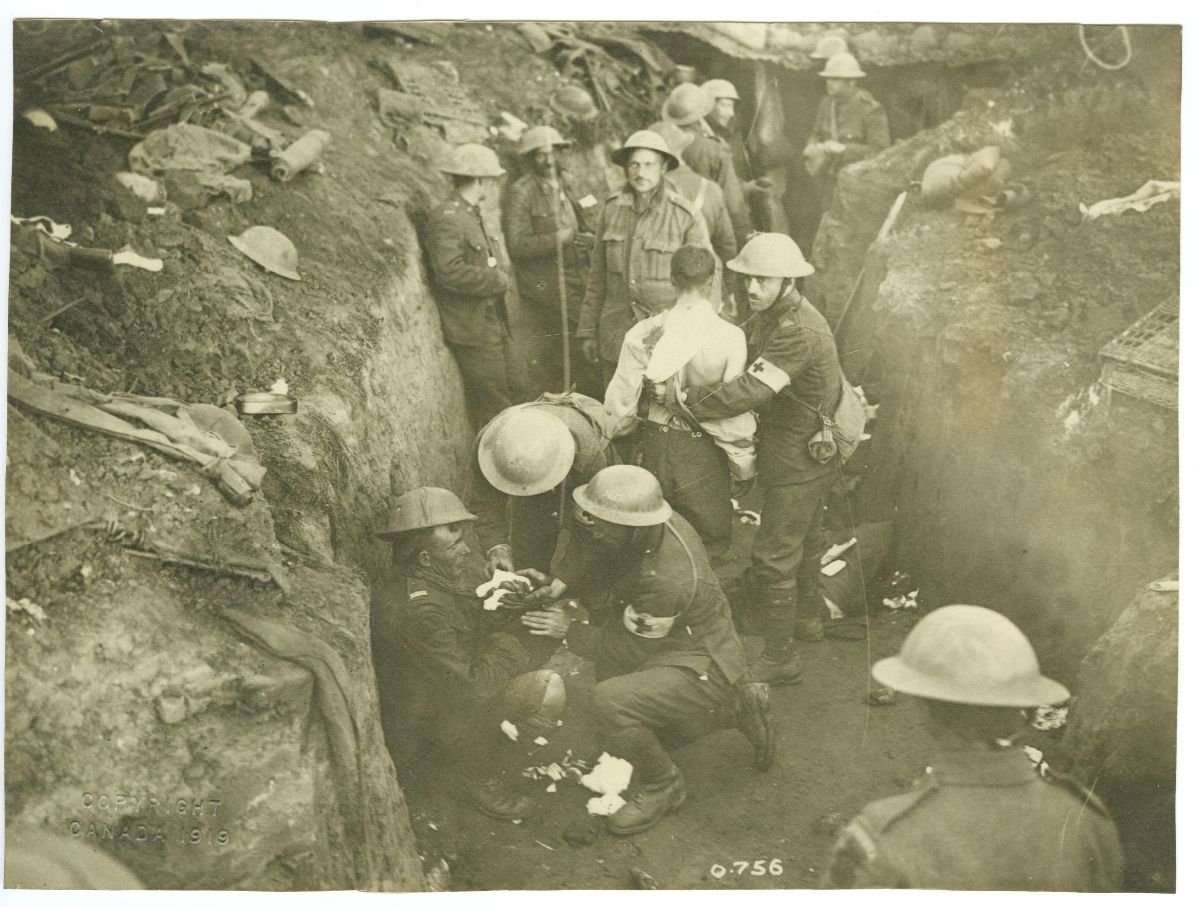 Many soldiers in uniform in a dirt trench wearing Brodie steel helmets. The wounded are waiting in line to be seen by a medic.Photograph Details