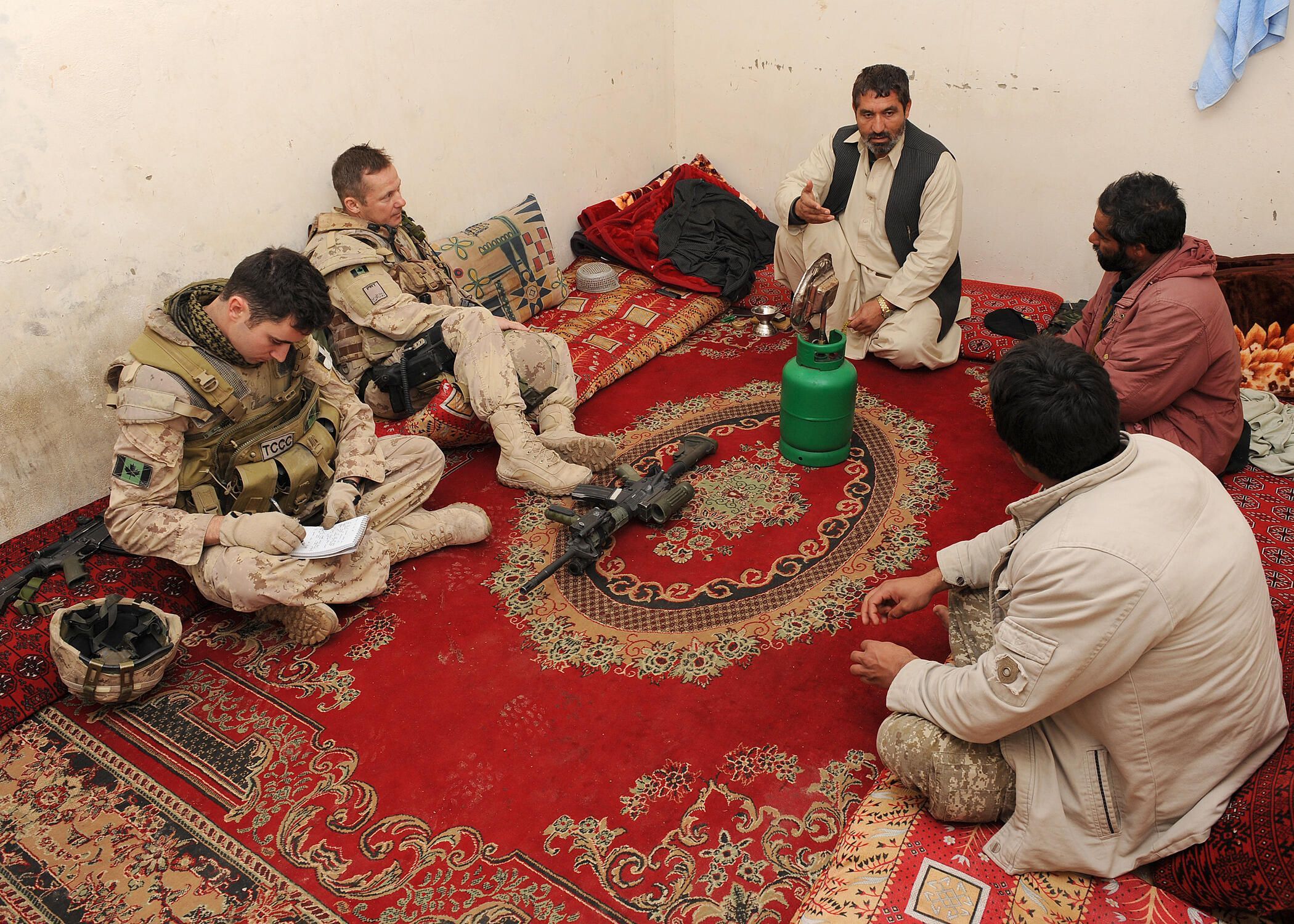 The CIMIC operators would go to these meetings unarmed to promote trust between the village leader and the Canadian Army. Here the weapons were left on the floor.Photograph Details