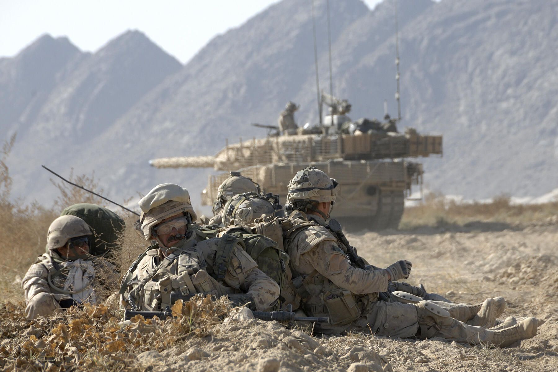 A group of Canadian infantry soldiers at rest while on patrol. They are supported by a Leopard C2 Tank.
