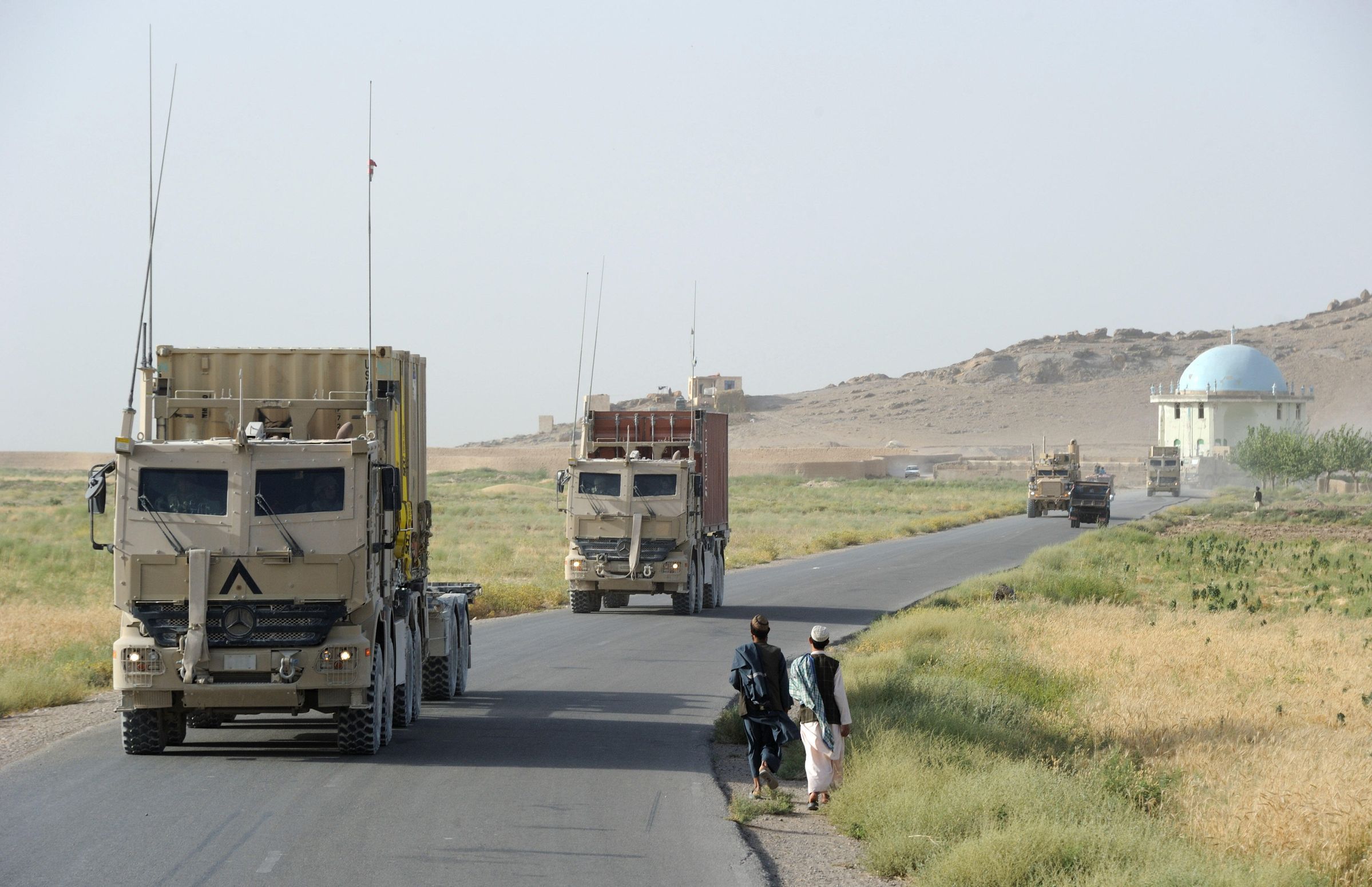 A convoy of several Actros AHSVS Armoured Military transport trucks is moving along the paved Highway 1 near Kandahar City, Afghanistan. The third vehicle in the convoy is a Cougar MRAP (Mine Resistant Ambush Protected) infantry mobility vehicle structured to be resistant to landmines and improvised munitions.Photograph Details
