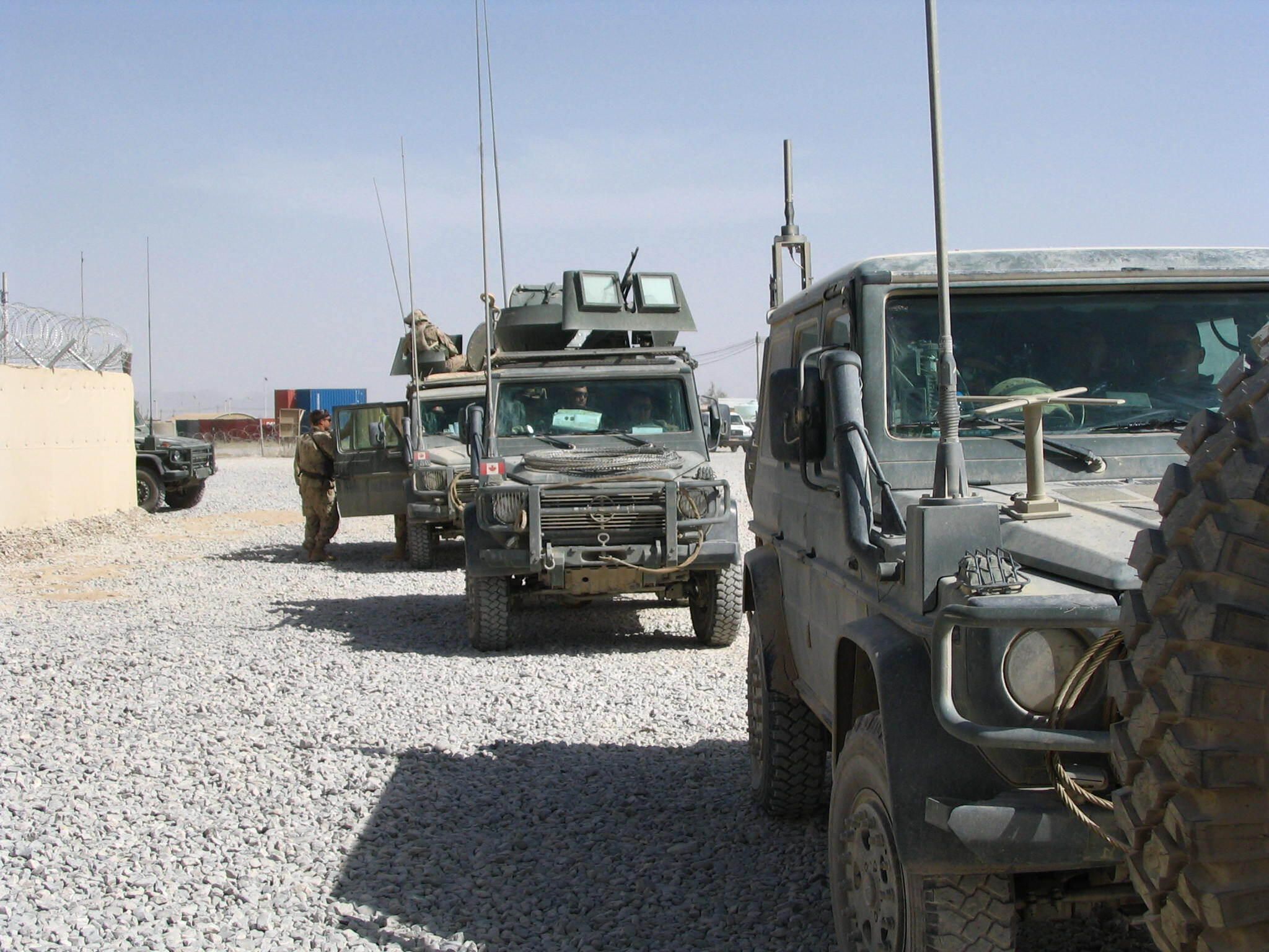 A series of military Mercedes G Wagons are moving in a line on a road in Kandahar. All vehicles are equipped with a radio antenna since they are in constant communications with operations headquarters located in Kandahar Airfield.Photograph Details