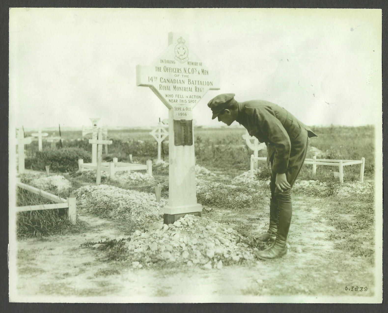 A soldier is standing in front of a Memorial Cross with the Regimental Crest and bearing the inscription: " In loving memory of the Officers N.C.O's & Men of the 14th Canadian Battalion Royal Montreal Regt. who fell in action near this spot, Sept & Oct. 1916 ". This was erected in what is now Bapaume Post Military Cemetery, Albert, Somme, France.Made/Created
