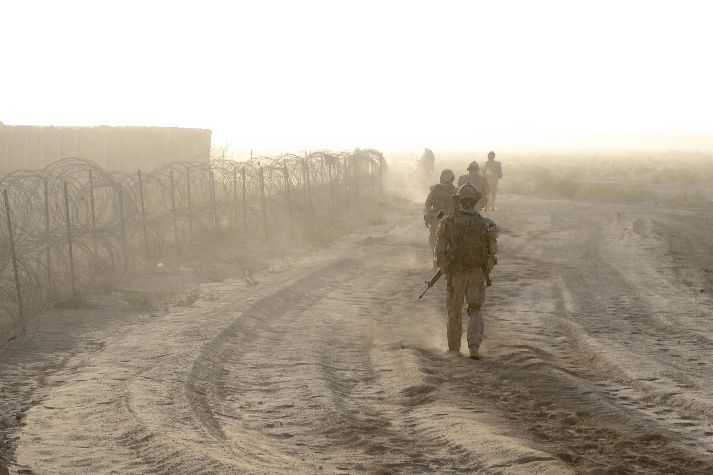 A group of Canadian soldiers are leaving the safety of the military camp and going out on patrol. They are walking past a razor wire fence and a Hesco Bastion protection wall. They are wearing complete safety attire: a ballistic vest, a pair of glasses, a helmet, a load bearing harness, spare water, spare ammunition, their personal weapon and a communication device.