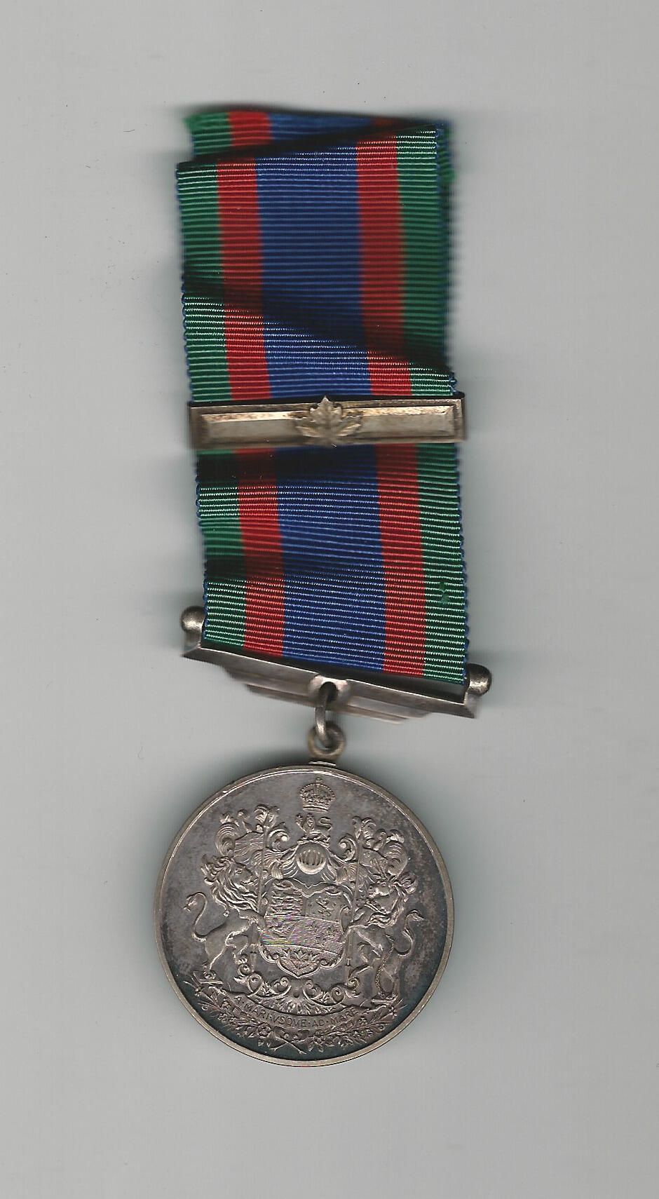 The silver bar, also known as a clasp, with a maple leaf in the centre denoted sixty days service outside Canada.