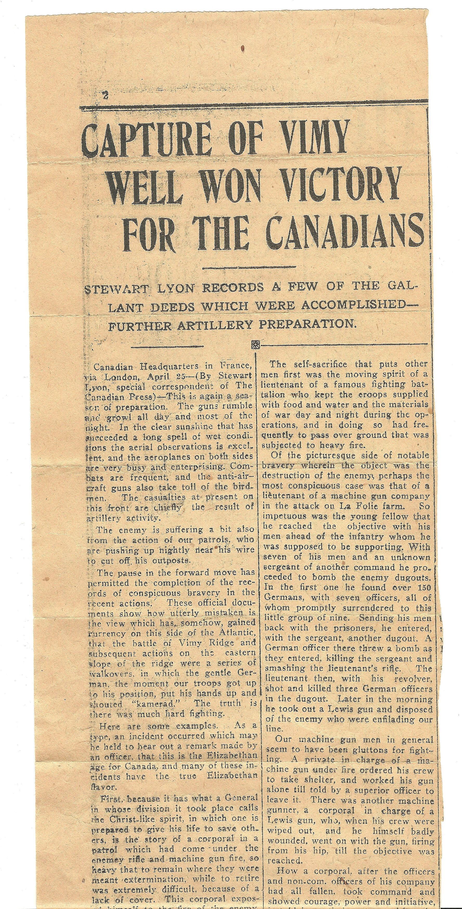 A newspaper clipping of a lengthy article from Canadian Headquarters in France, via London reporting on the exploits of the Canadian Army at the Battle of Vimy Ridge.Publication Details