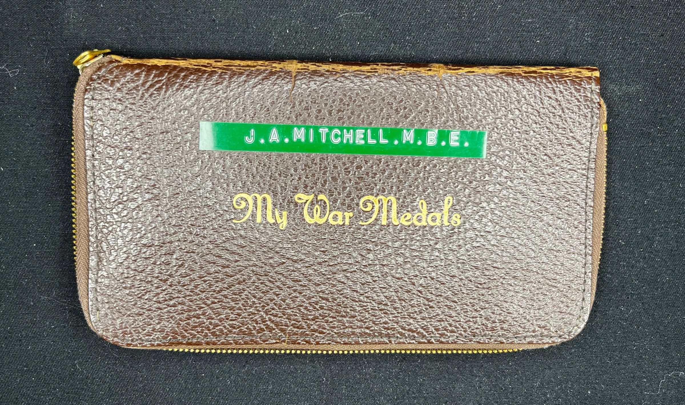 Brown pebbled leather carrying case for military medals. Embossed on the front in gold "MY WAR MEDALS" and on a green stick on tag above "J.A.MITCHELL.M.B.E". The case has a gold coloured zipper. Inside, there are slots for the medals and in green pencil, RSM Mitchell wrote his name inside as well 'J.A.MITCHELL'.