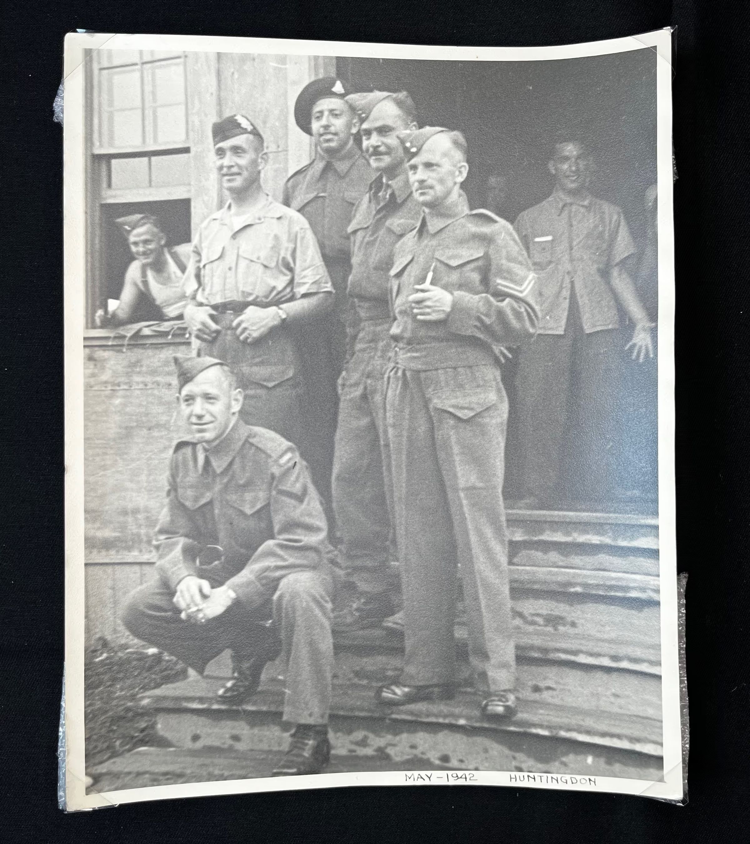 Casual group photo taken in Huntingdon, Quebec in May of 1942. 5 men stand on the stairs of a building, posing for a photo in their uniforms. In the background, there are 3 soldiers in more casual clothing. In the foreground, holding a cigarette in a holder is Maj. LowePhotograph Details