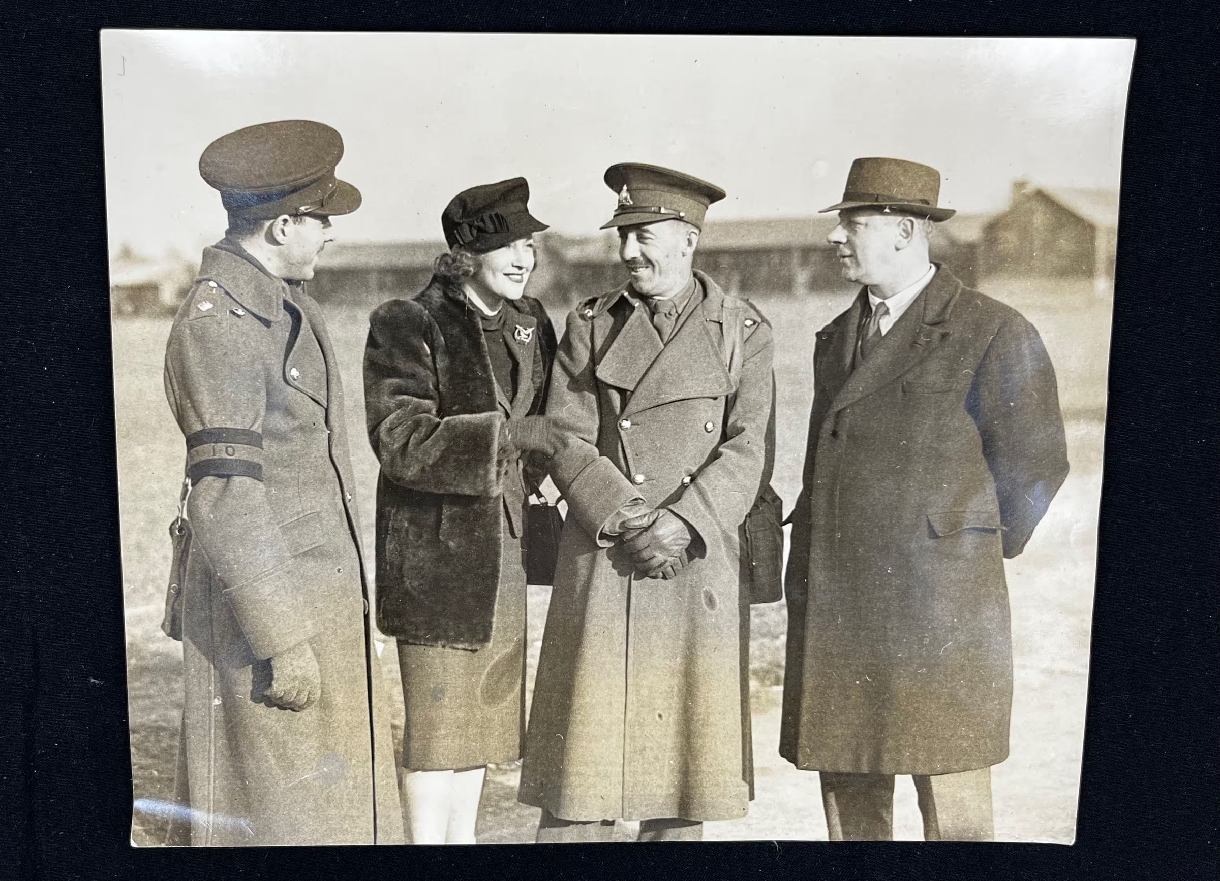 Candid black and white photo taken on a road with farm buildings in the background. Lt-Col Magnus stands far left, wearing his uniform, long coat, gloves, a shoulder bag and his striped Intelligence Officer armband is visible. He is looking at an unidentified woman who is wearing a dress, fur coat and a cap with a bow on her head. She wears a shoulder bag and gloves, and is standing closely to the unidentified man on her right. She is smiling and is probably mid-conversation. The next man wears his military uniform, (unsure what regiment but not RMR) long coat and gloves. He also has a shoulder bag. The last man is wearing smart civilian clothes with a hat. He is also unidentified.Photograph Details