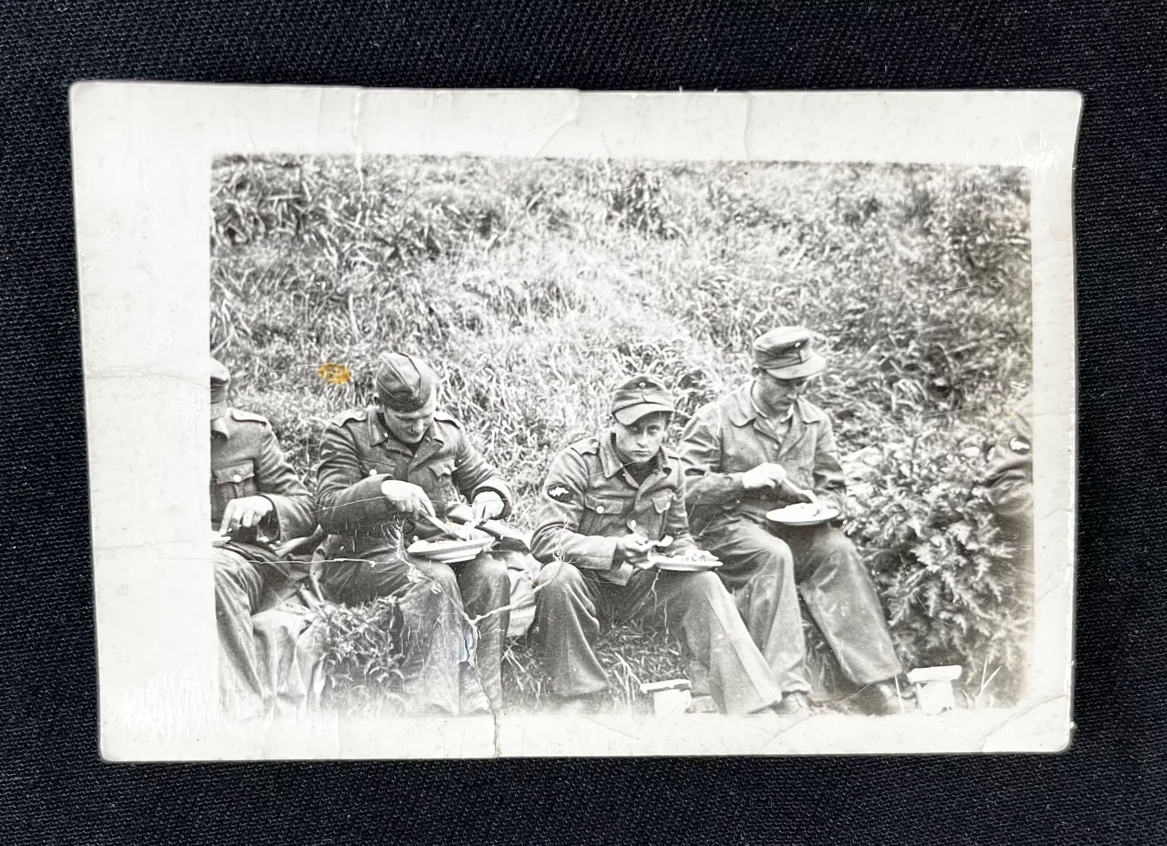 Small photograph, taken candidly of four soldiers sitting down in the grass eating a meal on their laps. The third man from the left looks into the camera. The three other men are focused on their food. All four men are in uniform. On the back of the photo the following is written: June 6, 1945, Amsterdam.