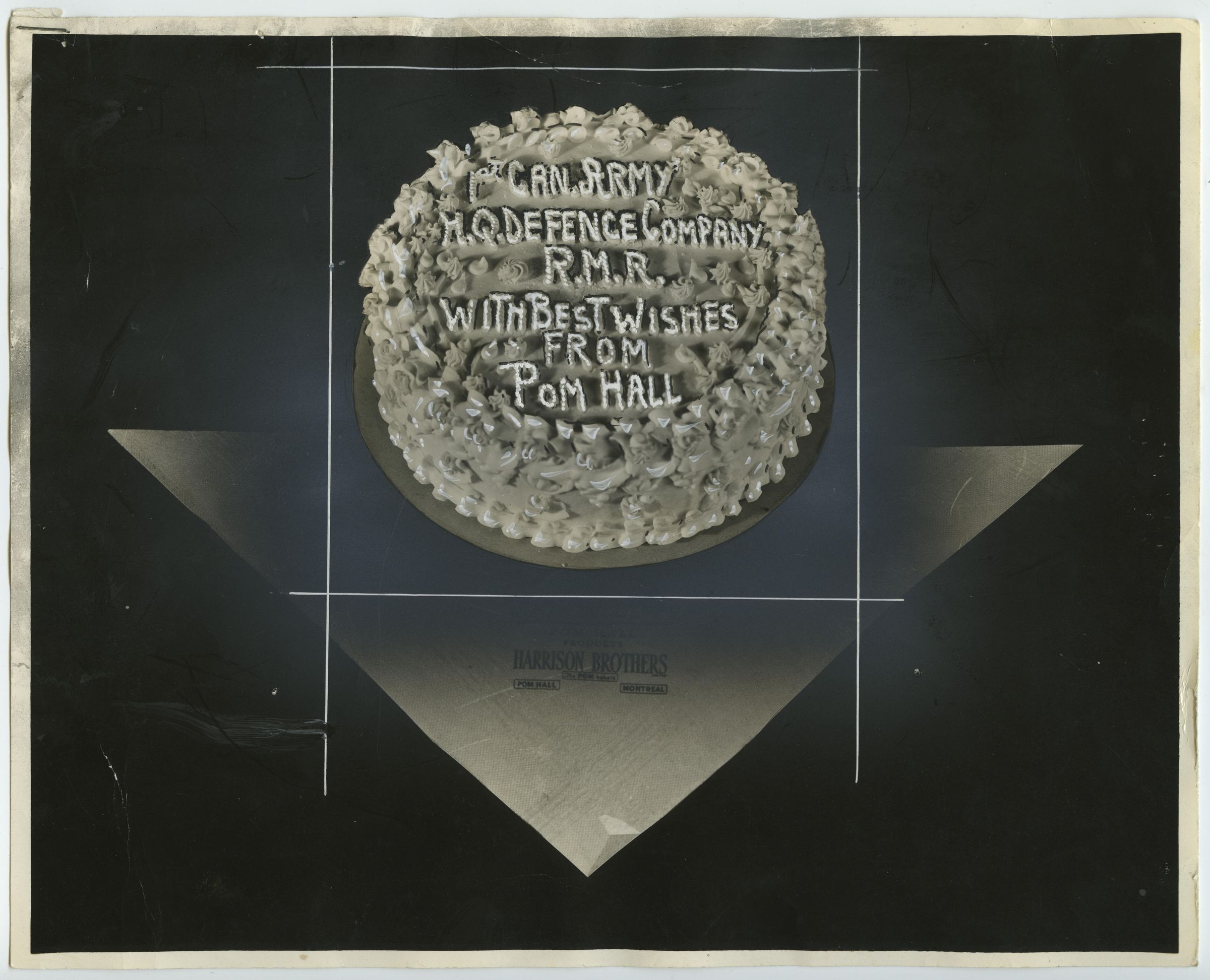 A celebratory cake, made with best wishes, to the 1st Canadian Army Headquarters Defence Company (RMR), by POM Hall. This cake was prepared in anticipation of the Victory in Europe (VE) day. It was sent by air on April 14th, hopefully, to make it in time for May 8th.
