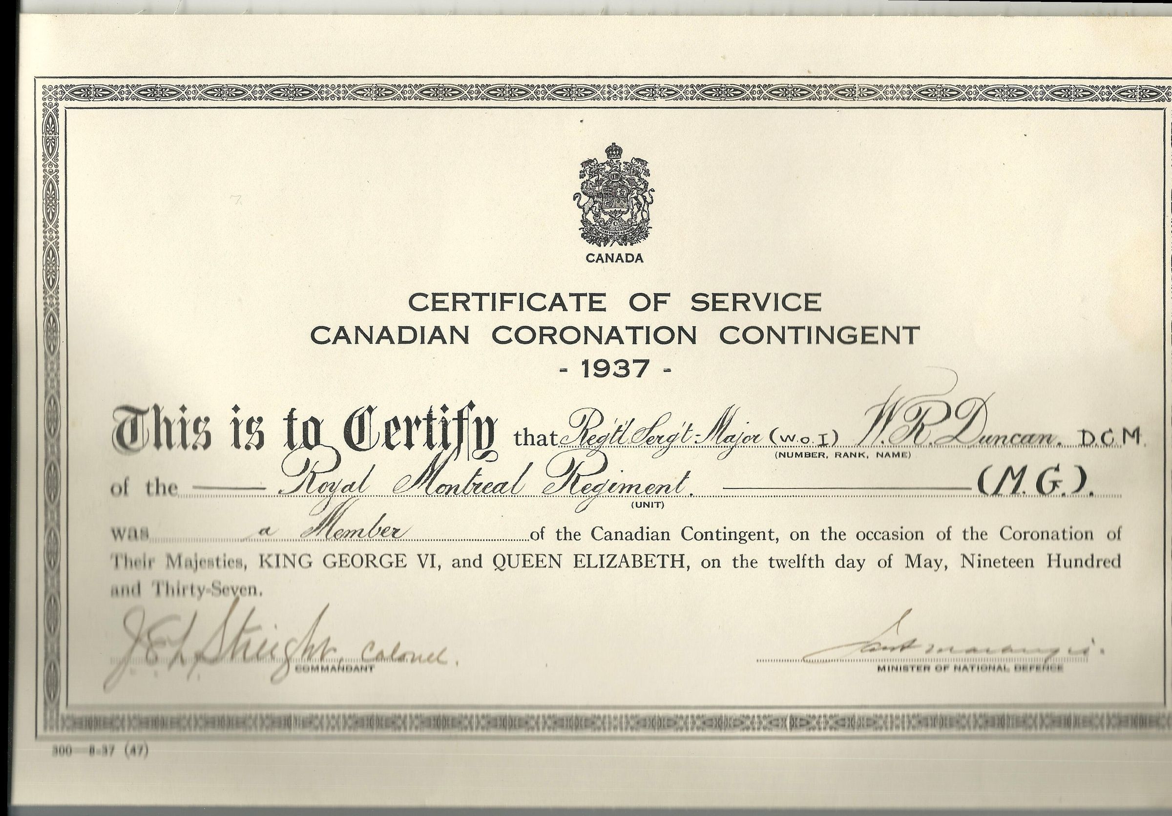 Certificate of Service acknowledging the service of RSM W. R. Duncan of the Royal Montreal Regiment (M.G.) in the Canadian Coronation Contingent May 12, 1937.Lexicon
