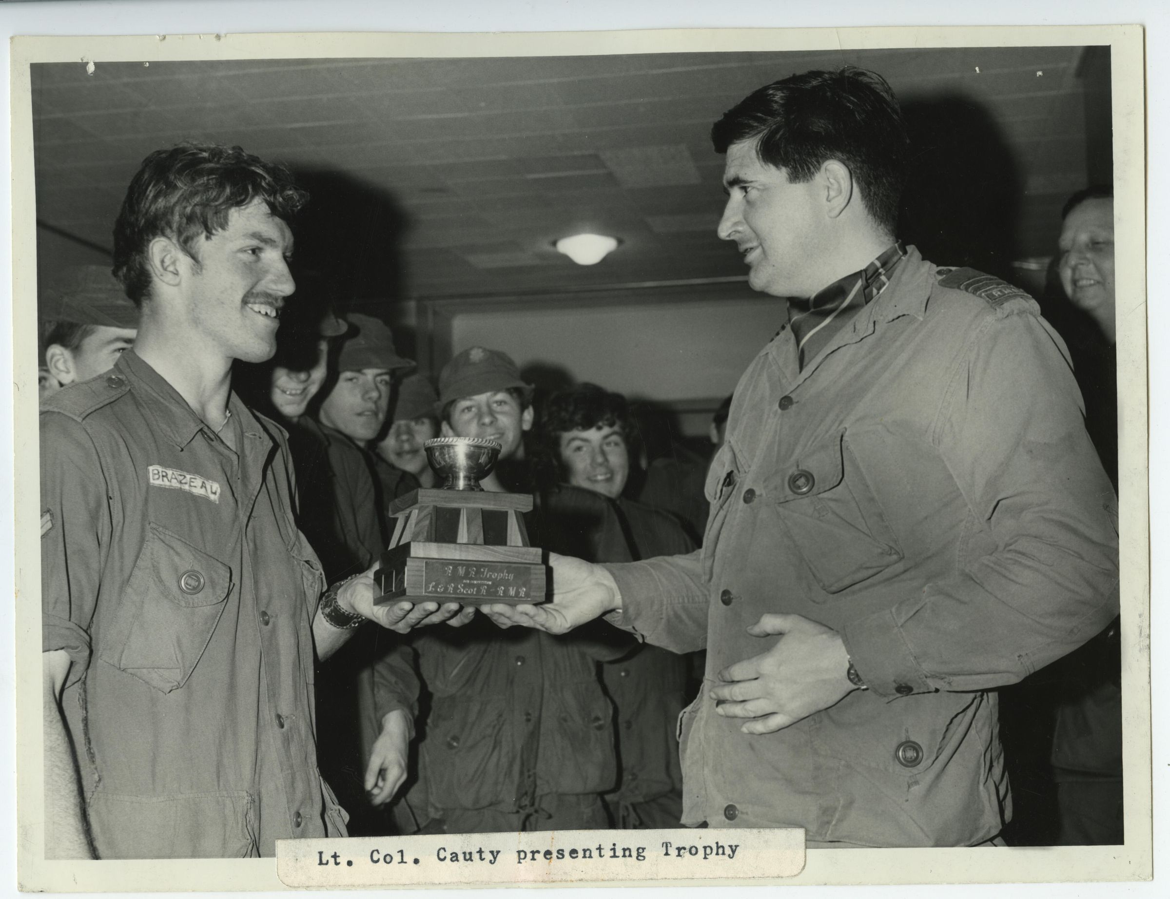 Lieutenant Colonel Arthur T. Cauty, the Commanding Officer of The Royal Montreal Regiment, presenting the RMR Challenge Trophy to Corporal Brazeau of The Lanark and Renfrew Scottish Regiment.Photograph Details