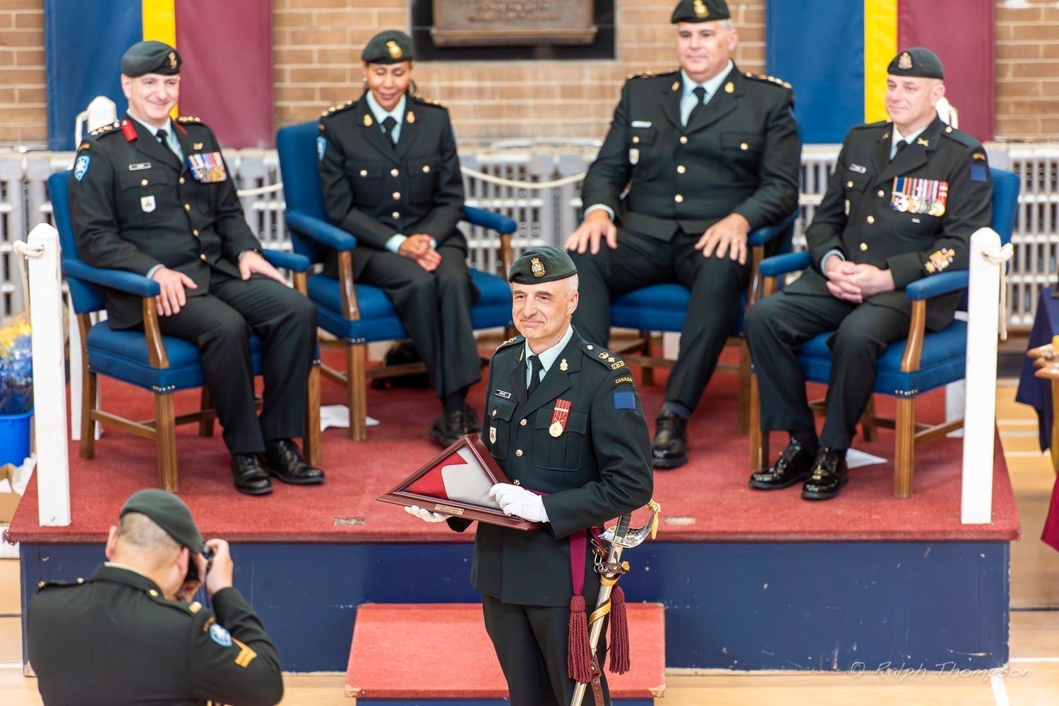 Change of command, May 4, 2025. The ceremony took place at the Westmount Armoury at 13:00. Former C.O. Lt-Col Jonasz poses for a photo holding a framed Canadian flag.
