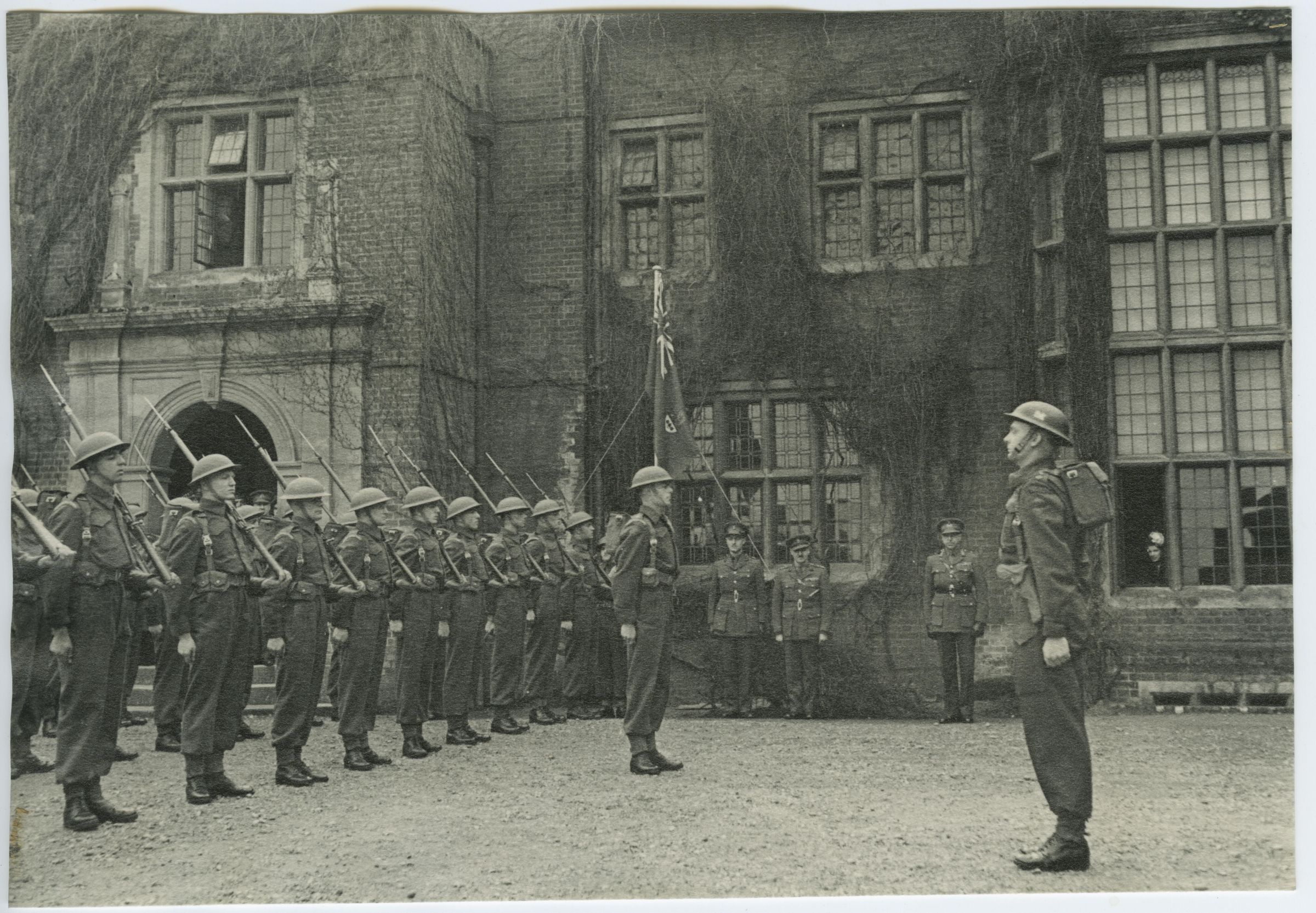 Scene from the changing of Guard ceremony held at the Canadian Army Headquarters at Headley Court, Epsom, when the Lorne Scots were relieved and The RMR started duties.Photograph Details