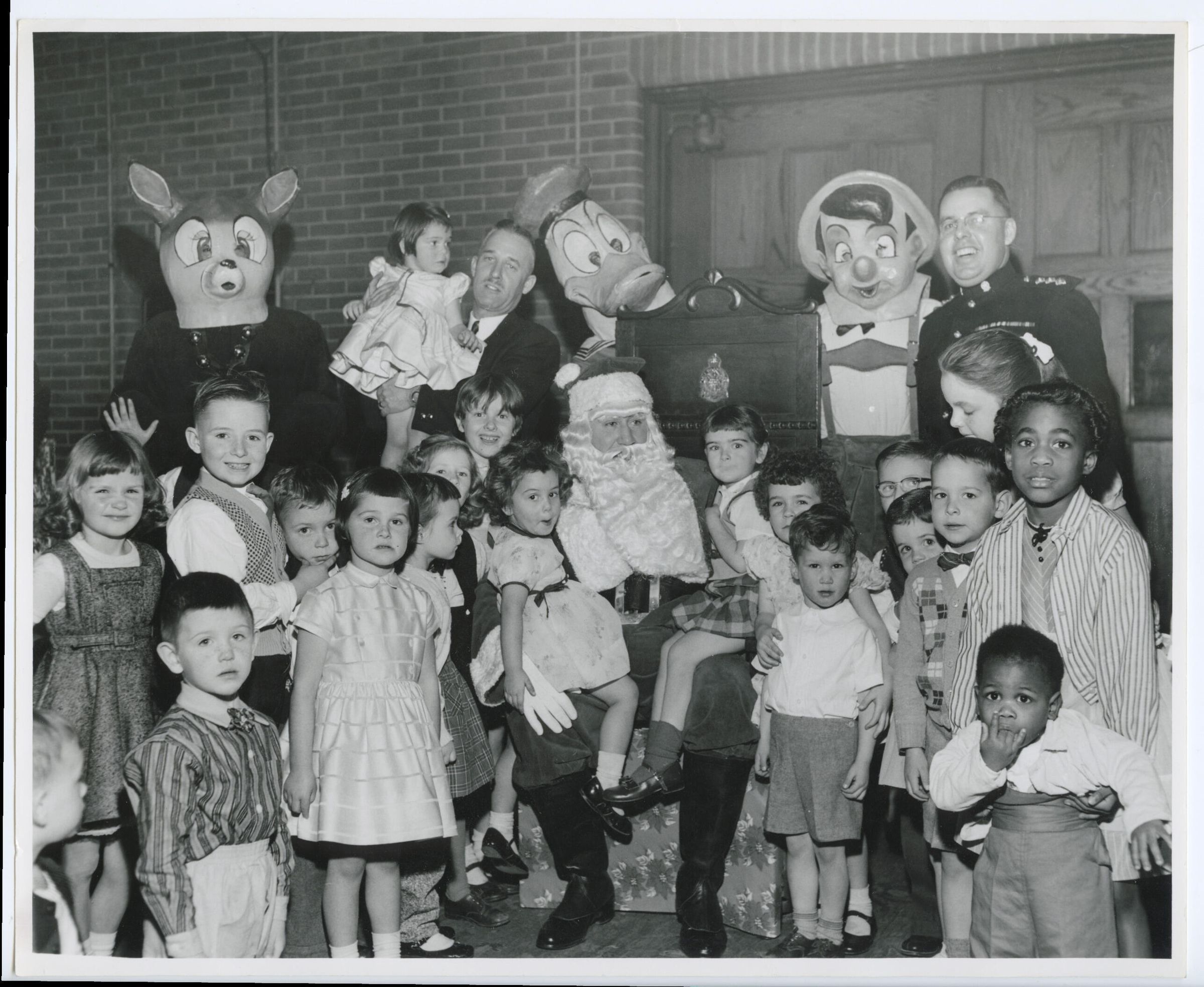 A photograph of Santa Claus seated in the RSM's chair with ex-RSM J. A. Mitchell and Captain Stanley Wood and various clowns surrounded by many small children dressed in their party clothes. This would have been one of the Regiment's Annual Children's Christmas Parties of the 1960's era.Photograph Details