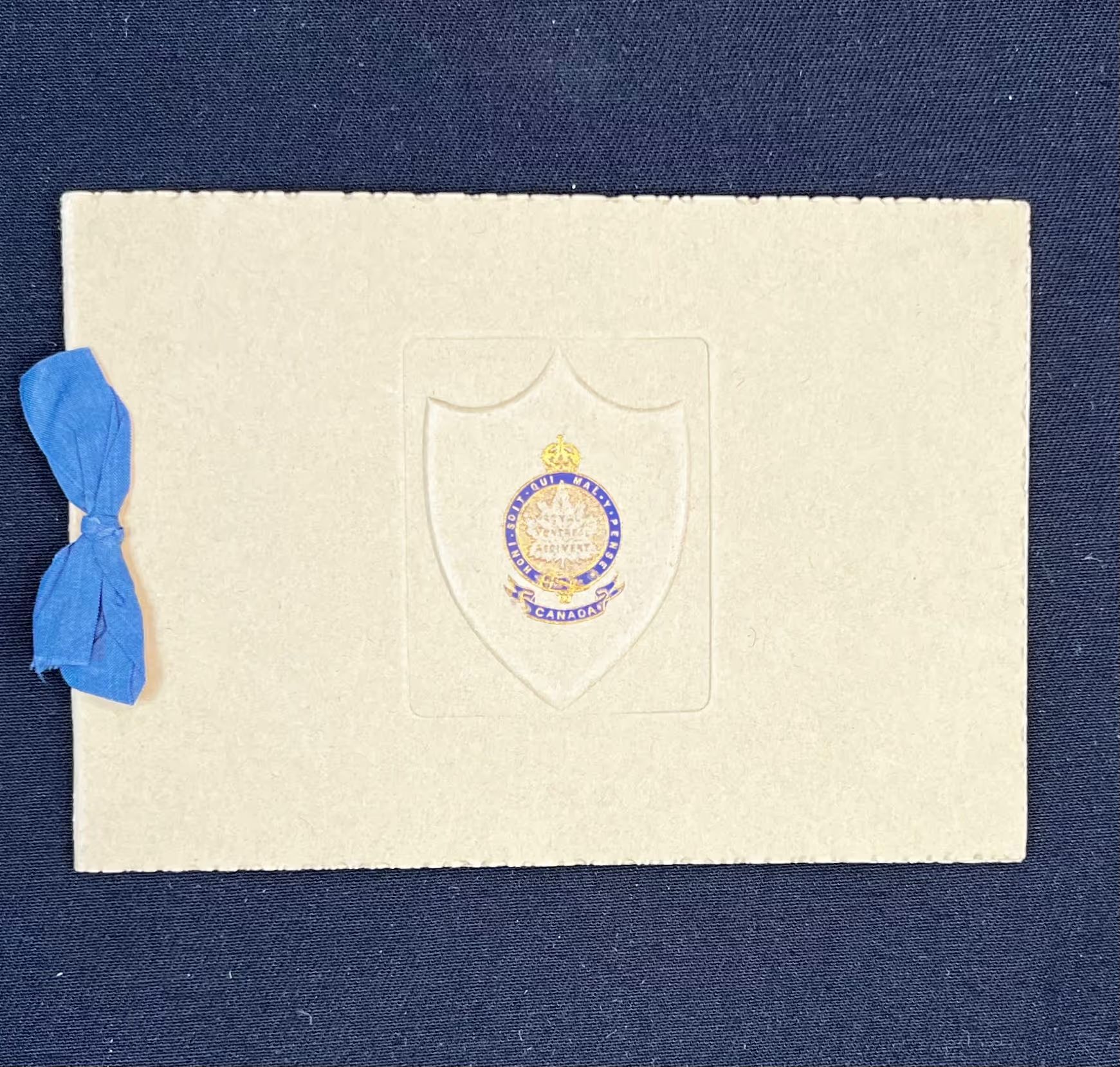 Brown coloured cardstock card with a blue fabric bow. In the centre there is an embossed shield with a gold and blue RMR crest. Inside, in blue print there is a quote on the left side and greetings from Lieut.-Col Frank Fisher and his officers for Christmas 1915 and New Years 1916. In very small embossing on the back cover there is the printer's name, "Cale & Polden Ltd, Aldershot"Subject Person/Organization