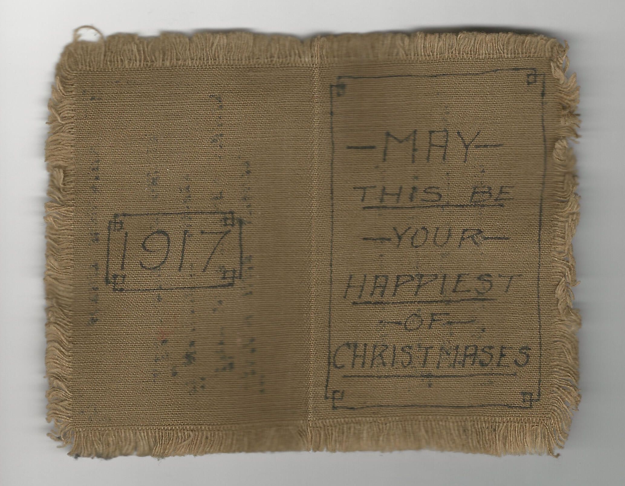 Crafted Christmas card made by Fred Bowman with the fabric from a uniform. Written with black ink in 1917.