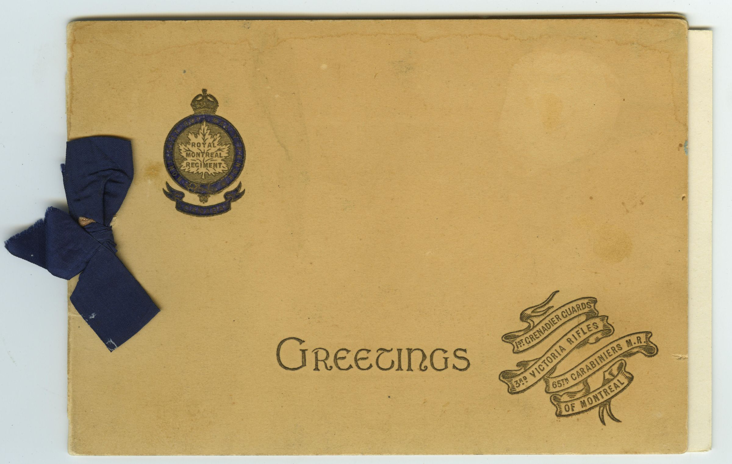 1914 Christmas card with a navy blue ribbon on the left and the RMR crest on the t.l. On the front b.r. is a series of ribbons on which are the names of the three Montreal regiments who provided the troops to establish the RMR in August 1914. Inside are printed wishes, a signature from someone named Jack, and a picture of the Royal Montreal Regiment formed up on Salisbury Plain in 1914.Made/Created