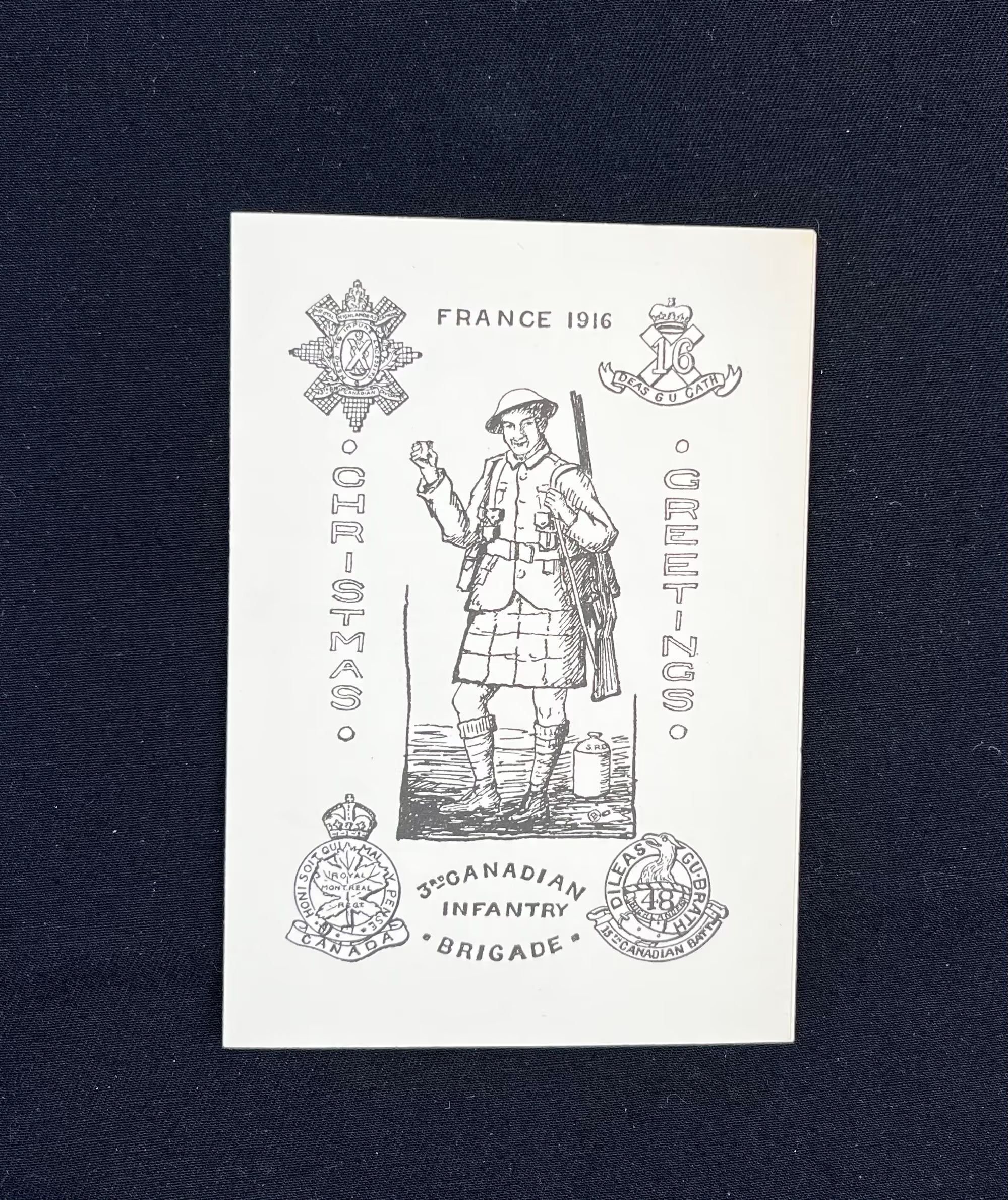 Christmas card, from France in 1916. The card is made of cardstock and features an image of a soldier in uniform on the front. On either side of him "Christmas" "Greetings" Overtop, "France 1916". Underneath, "3rd Canadian Infantry Brigade". Flanking the four corners are the badges of the four battalions in the Third Canadian Infantry Brigade. Top left: 13th Bn. (Royal Highlanders of Canada). Top right: 16th Bn. (Canadian Scottish). Bottom left: 14th Bn. (Royal Montreal Regiment). Bottom right: 15th Bn (48th Highlanders of Canada). Inside the card there is a printed message; "Brigadier General G.S. Tuxford, C.M.G. and Staff Wish you a Merry Christmas and a Happy New Year." The back is empty.Subject