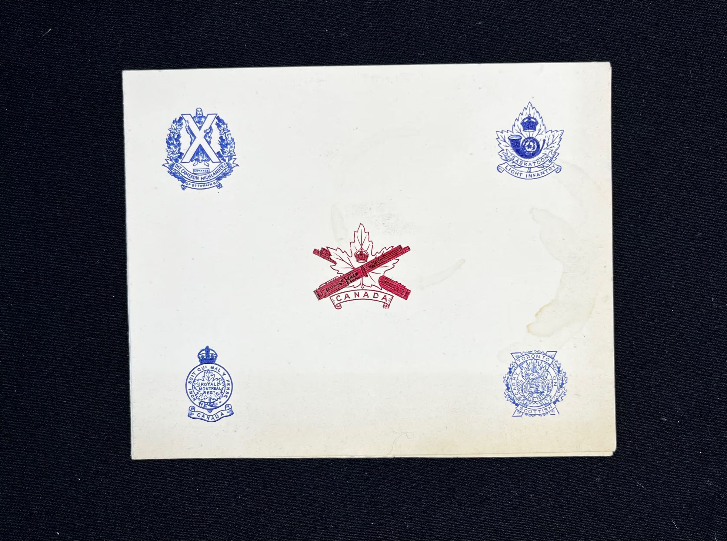 Christmas and New Years card, N.d.The card is made of white cardstock and has various military crests. In the centre, the canadian army badge in red. In the top left corner: The cameron highlanders of ottawa in blue. Top right corner: The Saskatoon Light Infantry in blue. Bottom left corner: RMR in blue. Bottom right corner: Toronto Scottish in blue. Inside the card, there is a handwritten note on the left side. " Meilleurs voeux de bonheur et de santé pour la nouvelle année. Joyeux Noël. Sgt. Packwood." On the right side of the card in printed text: "With best wishes for christmas and the coming year. No.1 Canadian Machine Gun Reinforcement Unit, Canadian Army (overseas)Subject