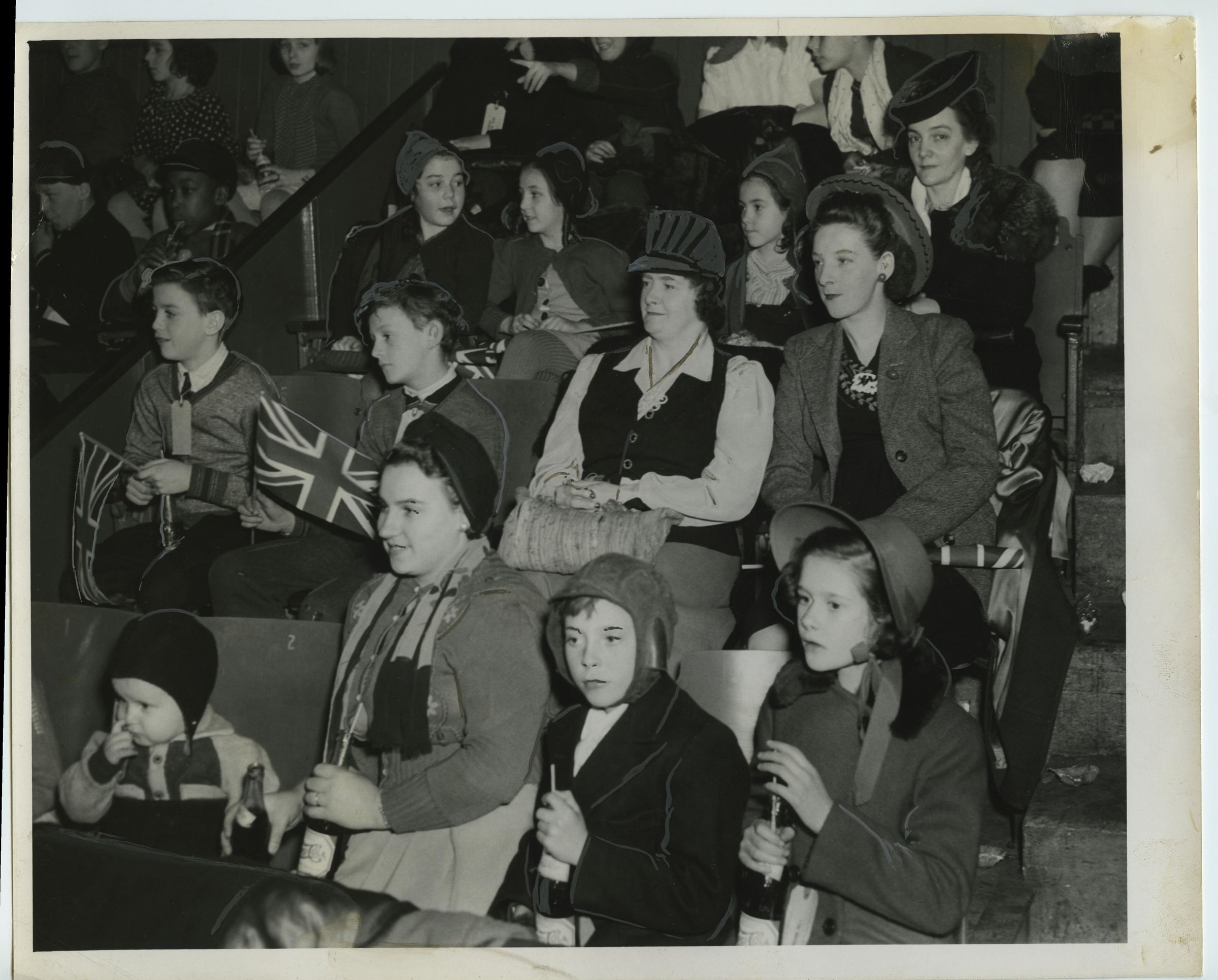 A scene from The Royal Montreal Regiment's Christmas Party of 1944 where children and women are seated in an auditorium for the event possibly taking place at the Montreal Forum. This image was published in the RMR Intercomm the following year along with photographs from the 1945 Christmas Party.Photograph Details