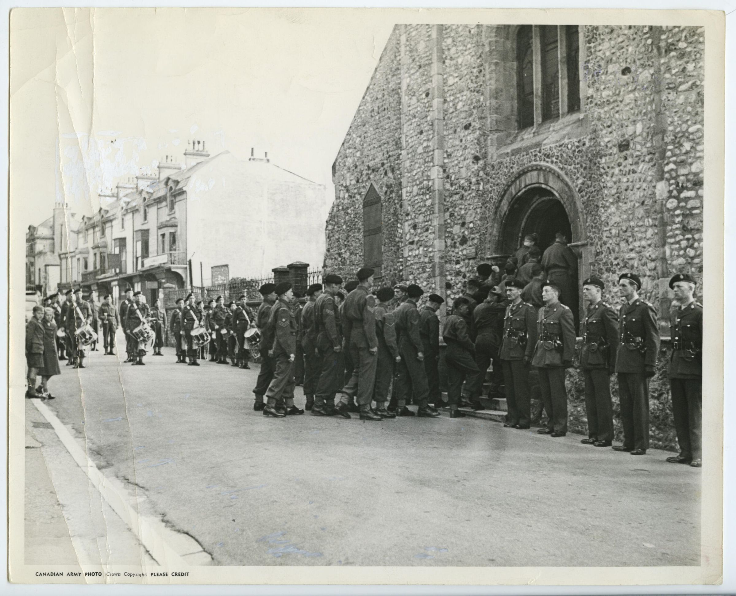 A photograph of the 32nd Cdn. Recce Regt. (RMR) entering St. Leonard's Church, Seaford, Sussex in 1943. The Regimental Band can be seen formed up in Church Street to the left while the Regimental Officers are lined up in front of the church on the right.Photograph Details