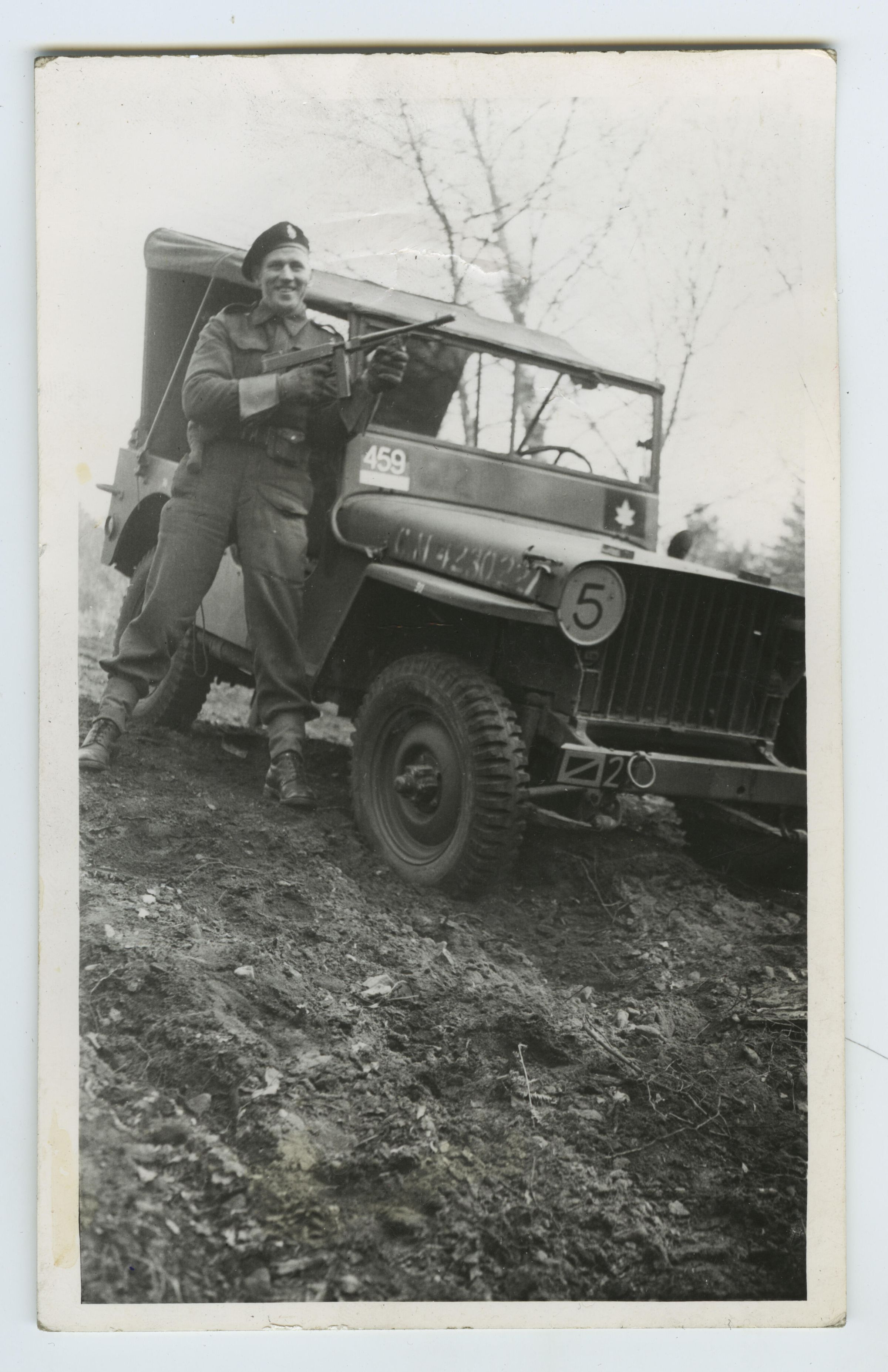 He is dressed in a battledress uniform with the black beret of the Armoured Corps. He is armed with a .45 cal Thompson Sub-machine-gun.Photograph Details