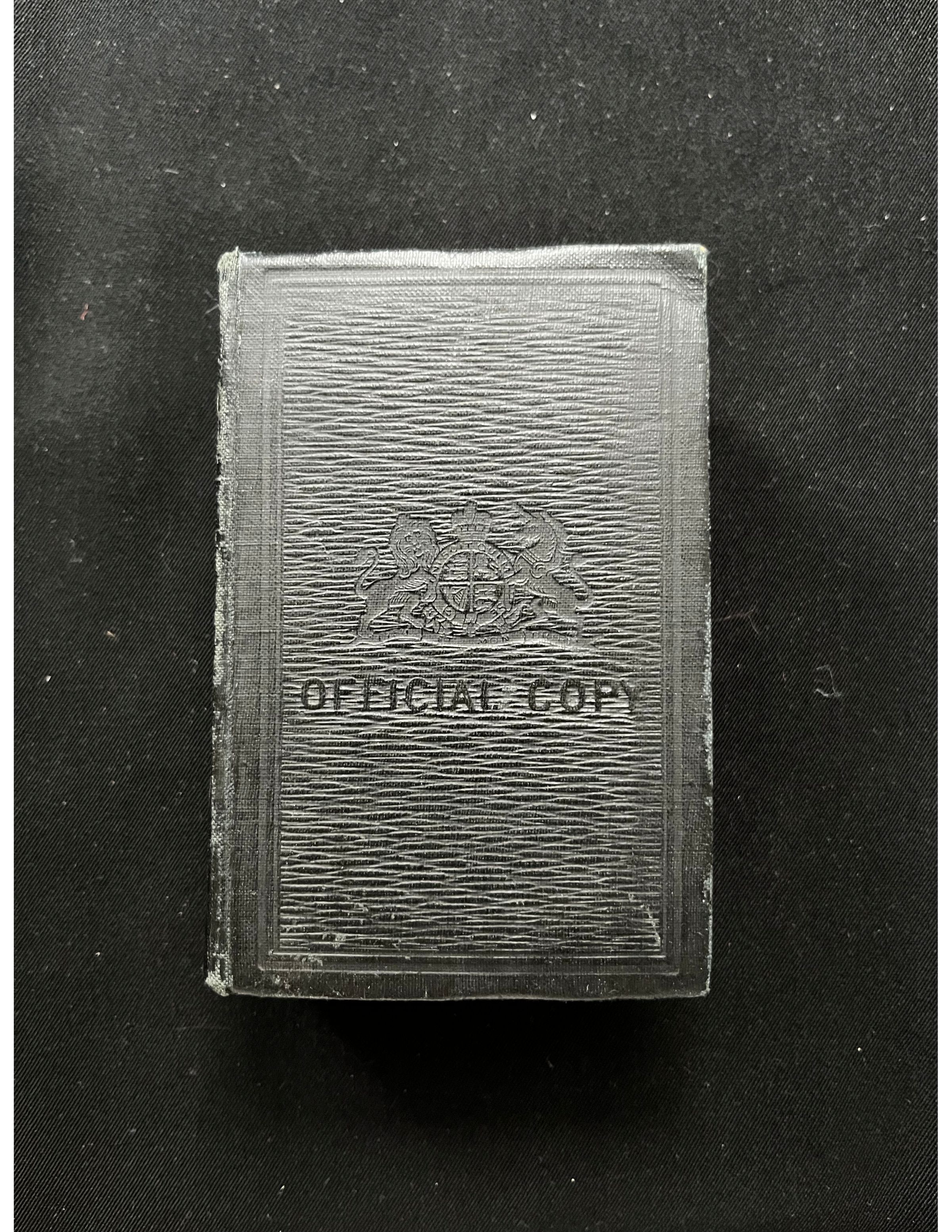 Small black leather covered prayer book. The outside of the pages are coloured red. Embossed on the front of the book is the UK's crest, and "OFFICIAL COPY". On the spine, "COMMON PRAYER HYMNS". Then back cover also has the crest embossed. The publisher is "William Clowes & Sons Limited, 94 Jermyn Street, London, S.W.1."Use