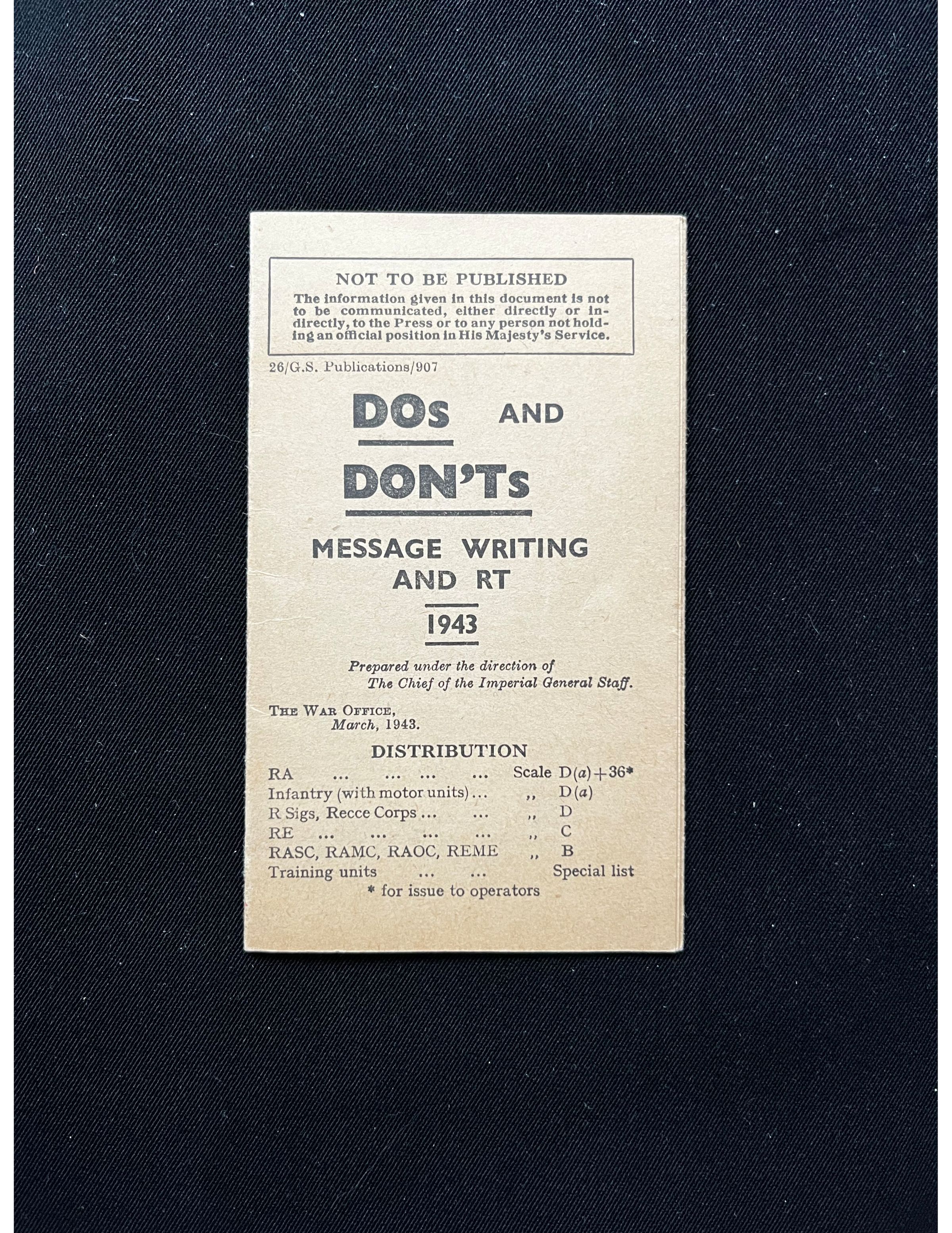 Pocket card prepared for unit signalers it provided tips for the preparation of messages and use of radios in the Second World War. As noted on the cover, this booklet was distributed to the following : RA, Infantry (with motor units), R. Sigs, Recce Corps, RE, RASC, RAMC, RAOC, REME, Training Units.