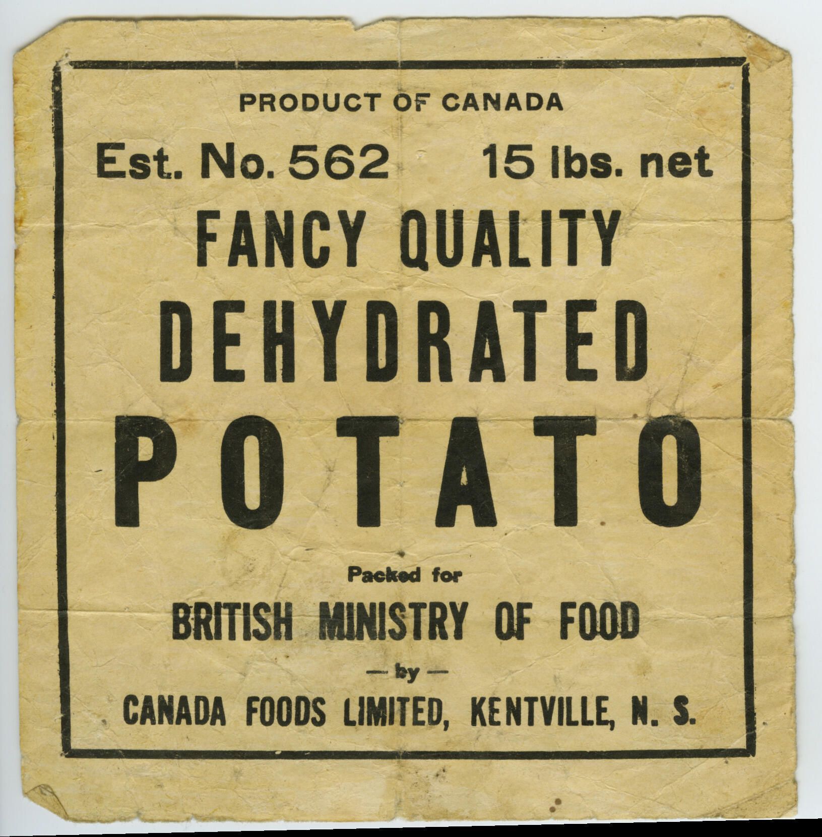 A black and white packaging label for dehydrated potato. There is a humorous notation on the back, alluding to the rumours that the soldiers are getting the best food & eating better than the folks back home.