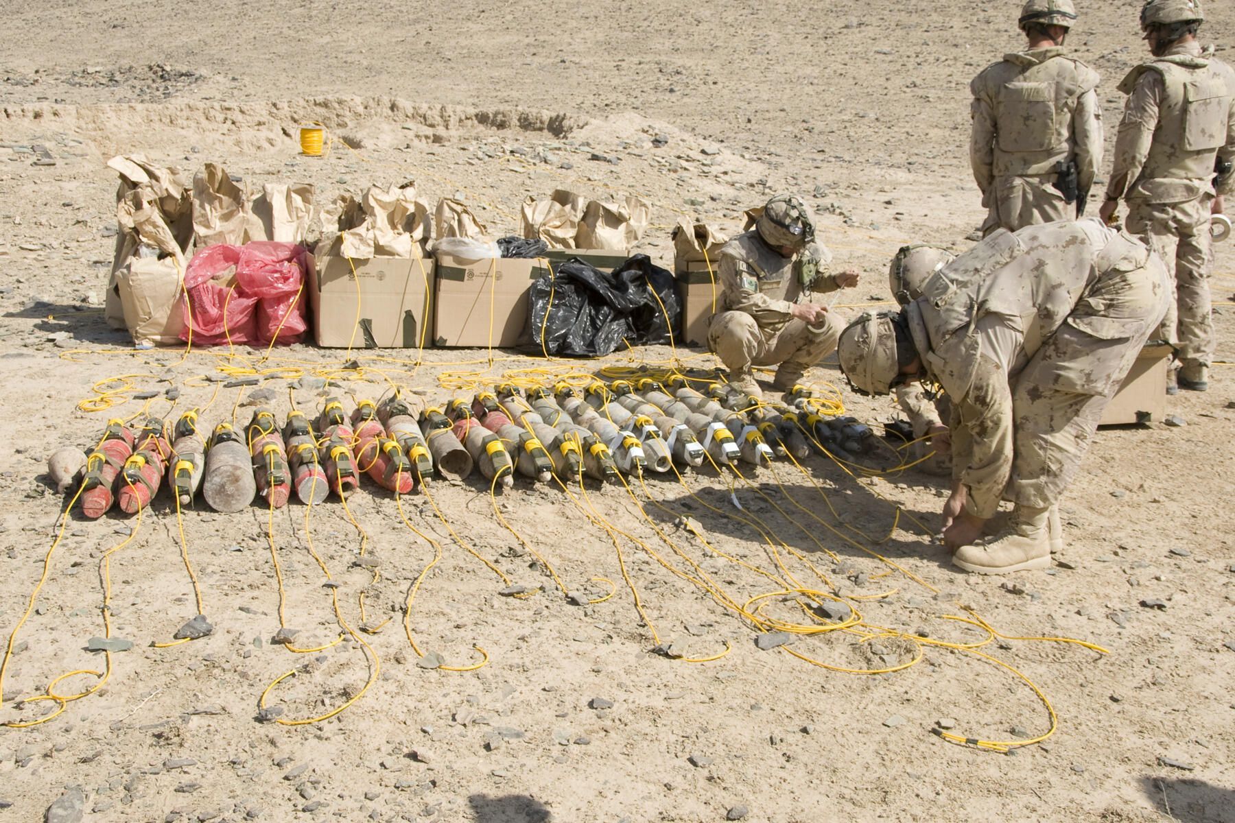 A group of Canadian Combat Engineers at work preparing small individual charges of C4 explosives to destroy the gathered munitions and explosives.