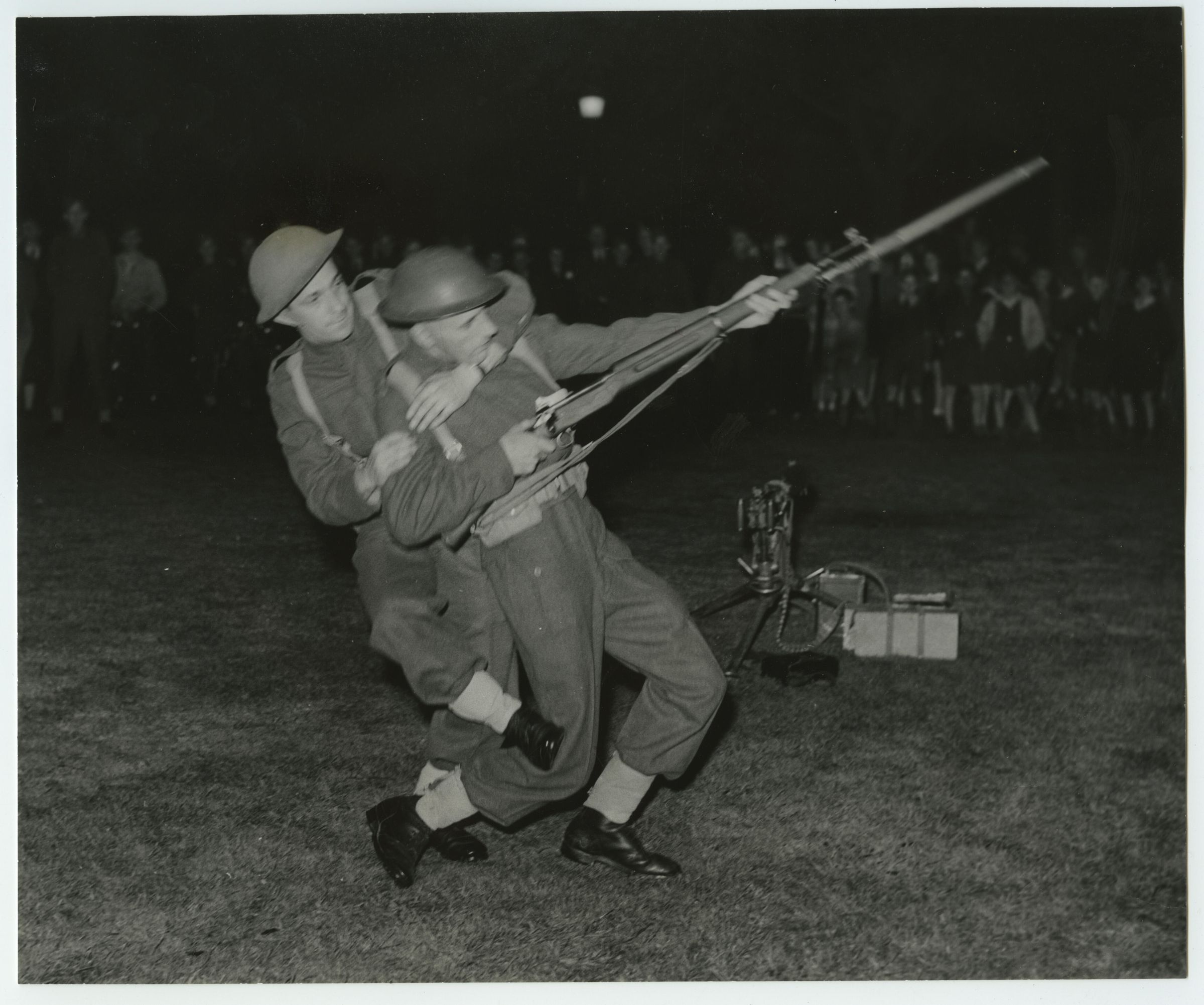 Two men from ''C'' Company of the 2nd Battalion, RMR, in uniform giving an evening demonstration of unarmed combat. The man behind is disarming the other one in an attempt to seize his weapon. Ju-Jitsu was part of the training of Canada's modern fighting forces. In the darkness an audience is gathered around them.Photograph Details