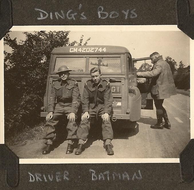 A black and white photo of Lieutenant Colonel James A. ''Ding'' Calder's batman and driver, Lance Corporal Eddy Lavery. He is seated on the bumper of a 1941 Ford C11AD Militarized Station-wagon wearing battledress and a helmet along with the three WWI medal ribbons on his left breast. To Lavery's left is an unidentified soldier wearing his battledress uniform in a rather more casual manner.Photograph Details