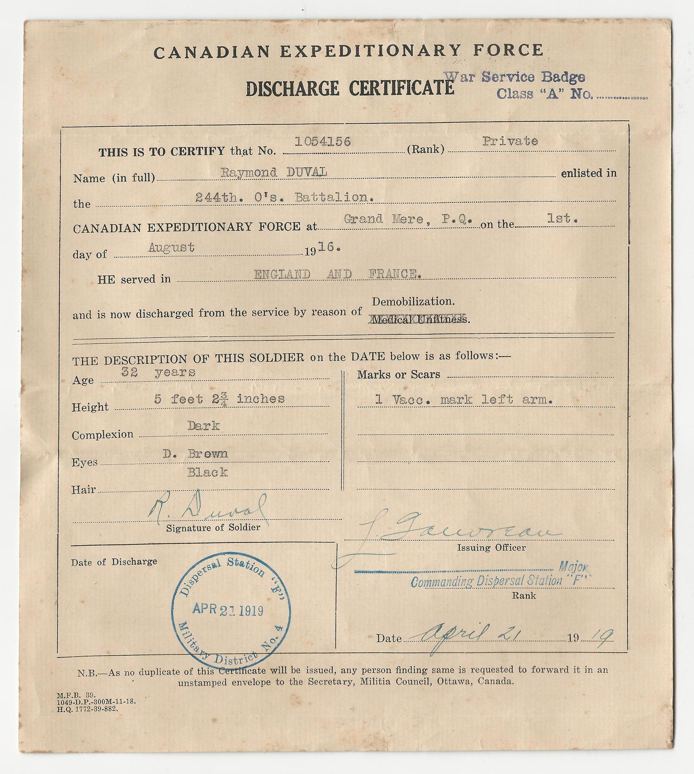 A Canadian Expeditionary Force Discharge Certificate issued to Private Raymond Duval on April 21, 1919 when he was honourably discharged from the Army at Montreal upon demobilization after completion of hostilities. It is a printed form with details filled in by typewriter and signed by an officer and Private Duval.Archive Details
