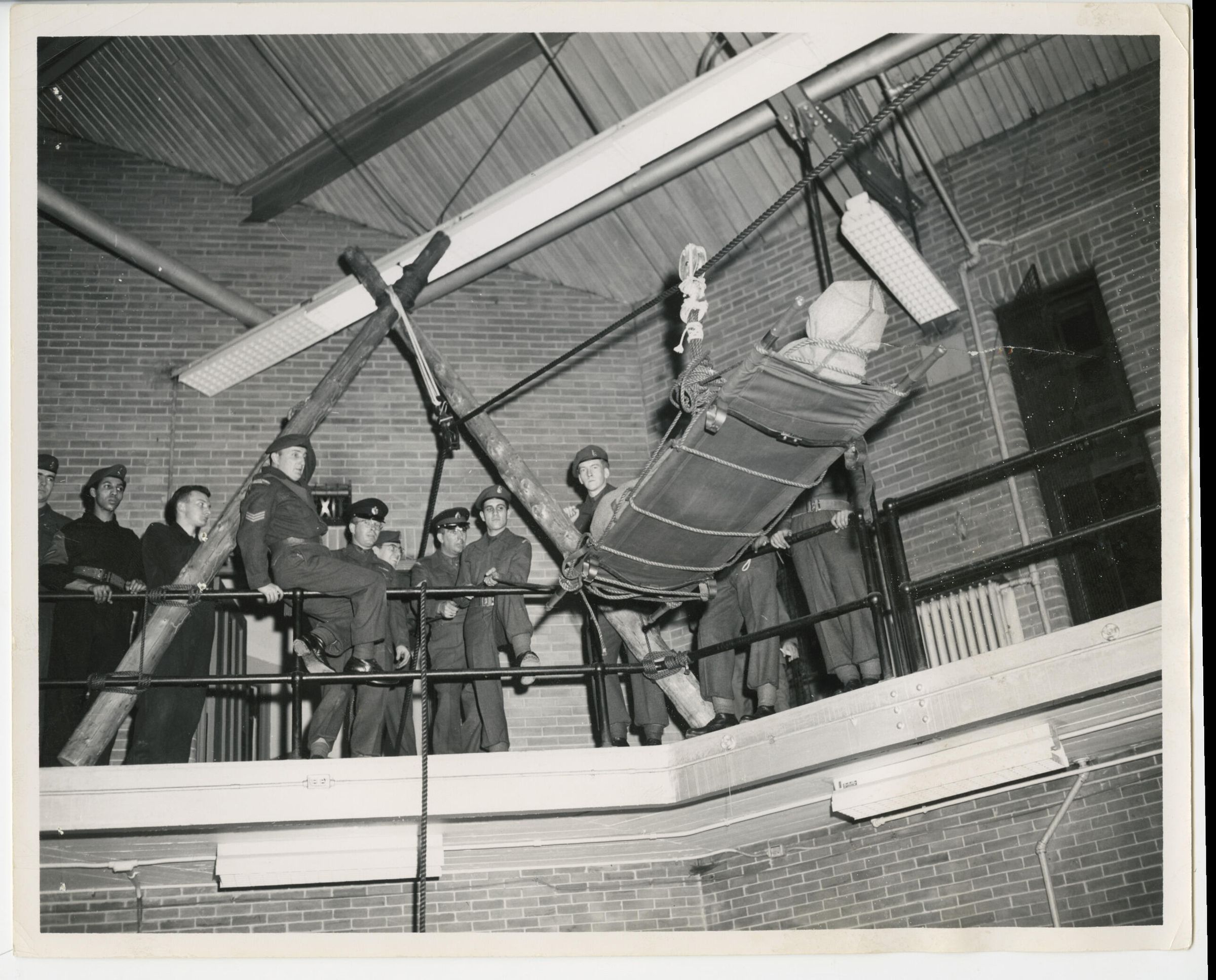 A scene from a public display of methods of casualty evacuation during a demonstration held at the Westmount Armoury. Here, a mannequin is lowered safely on a stretcher from the second floor to the first floor.Photograph Details