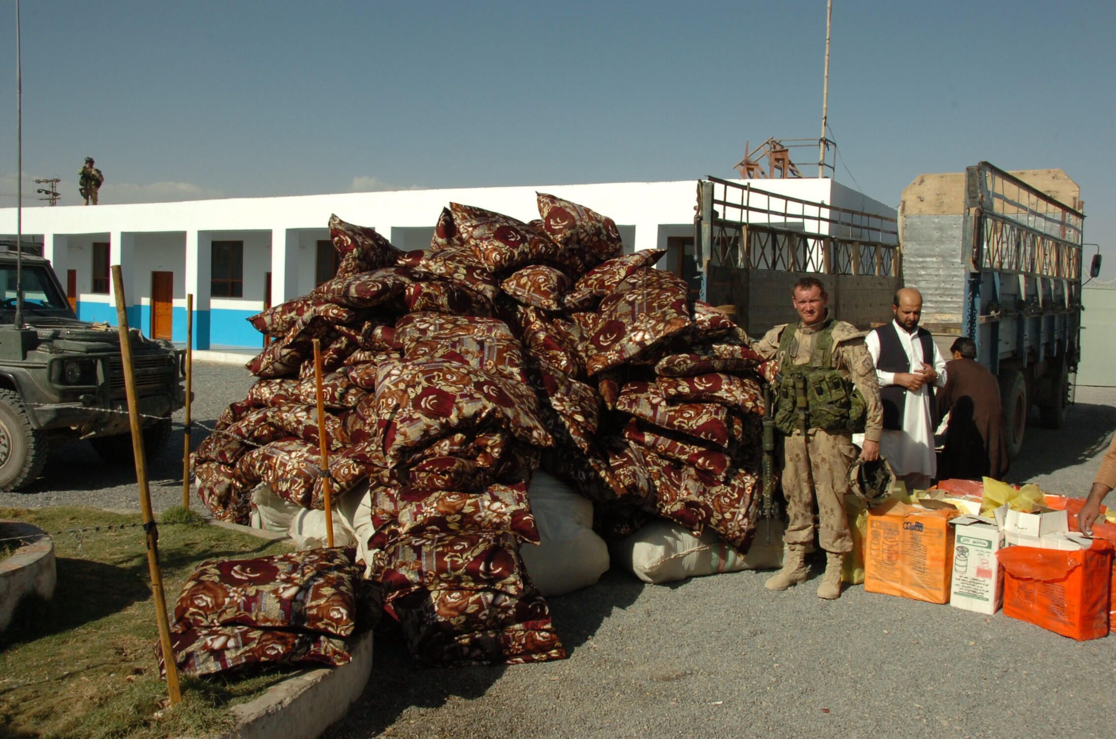 A truckload of donated carpets, cushions and dry goods being prepared for delivery to the Karzai orphanage by Civil-Military Cooperation (CIMIC) operators. The funding for these donations would generally come from a variety of sources including the donation of private individuals, groups or government aid projects.Photograph Details