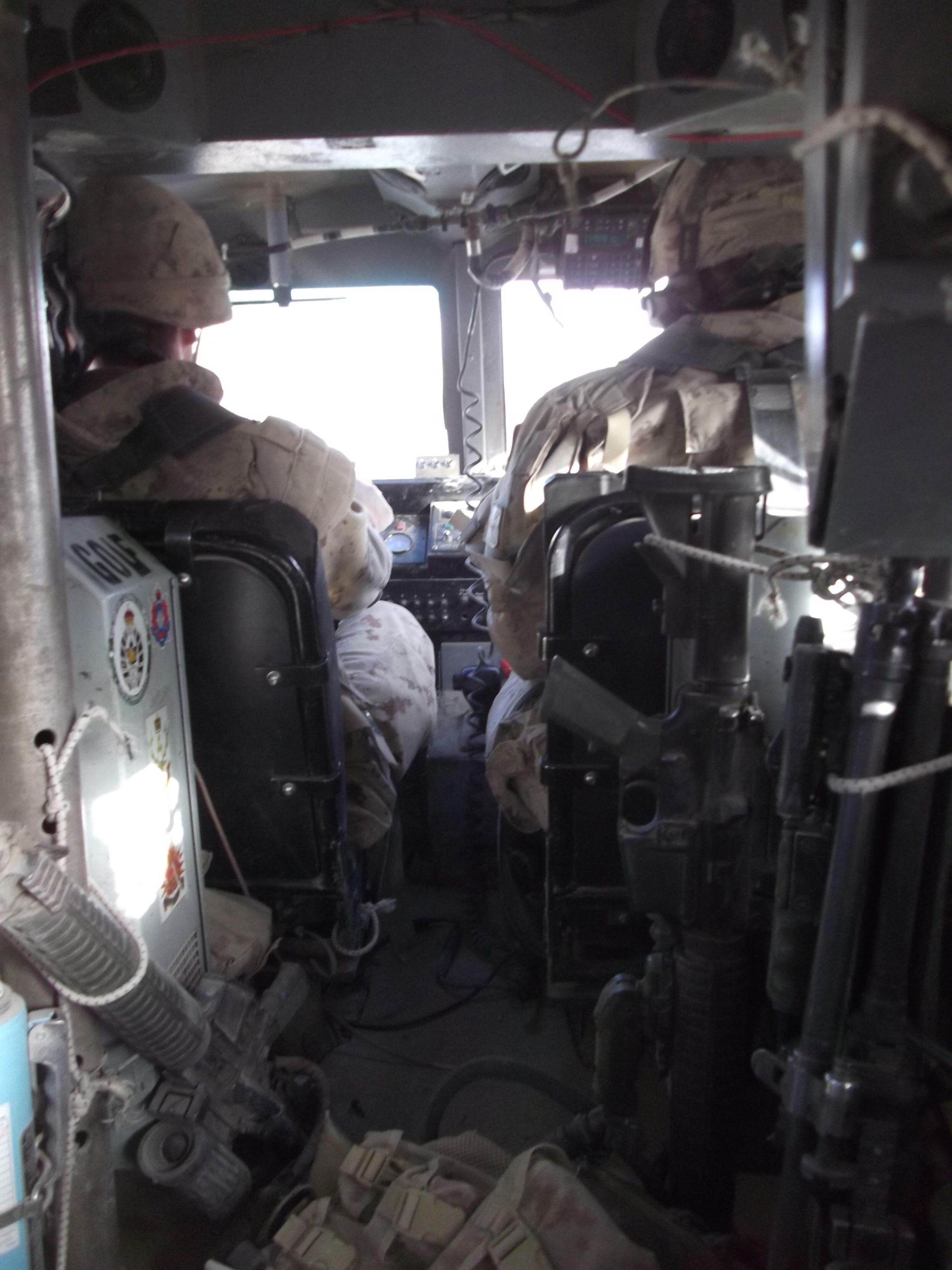 Photo taken in the driver and co-driver compartment of an RG33 Cougar Mine Resistant Ambush Protected (MRAP) infantry mobility vehicle. The crew are wearing a ballistic vest and helmet at all times, their personal weapons are within easy reach. The crew is in constant radio contact with other elements of the patrol.Photograph Details