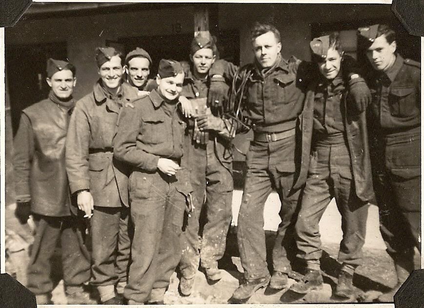 A black and white photo of eight (8) soldiers wearing battledress uniforms. Several are wearing leather jerkins and are mud-spattered. These are the men from the Signals Section & Dispatch Riders of the 1st Battalion RMR.Photograph Details