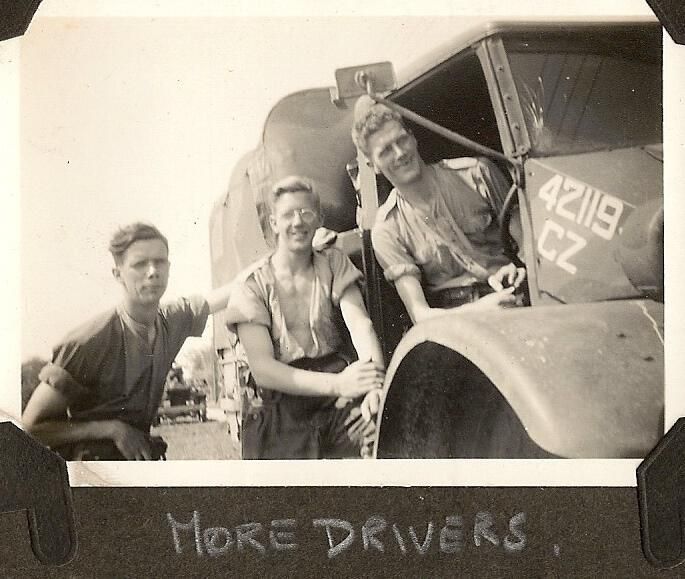 A black and white photo of three drivers of the 32nd Reconnaissance Regiment (RMR) standing or seated beside a 30cwt Chevrolet CMP Truck.Photograph Details