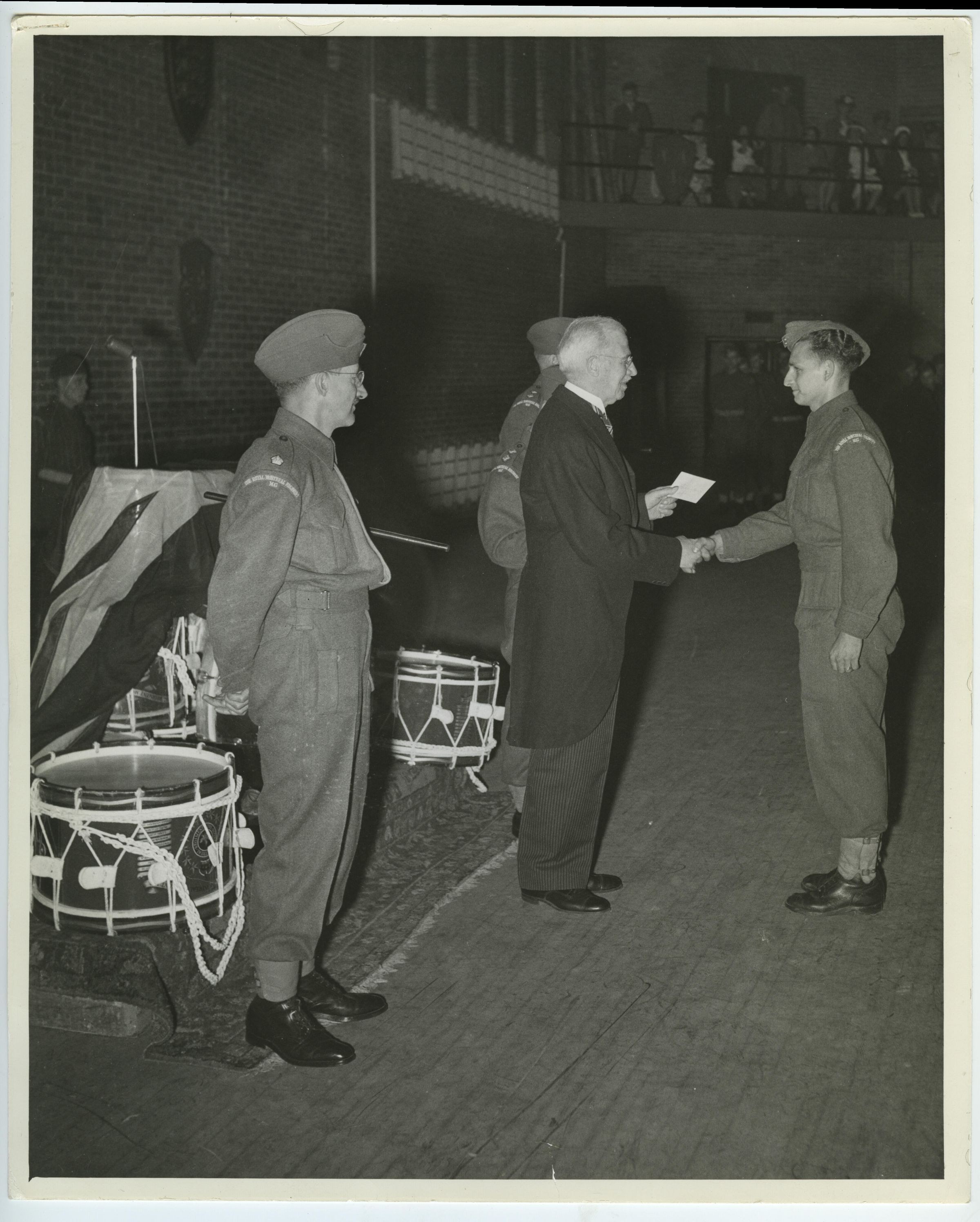 The presentation of certificates and prizes during a drum head religious service for the members of 2nd Bn., The Royal Montreal Regiment, in the Armoury. Here Private Roy Knox is receiving an award from Lieutenant Colonel Frank W. Fisher while the Battalion Commander, Lieut.-Col. Hugh G. Brewer, stands at the left.Photograph Details