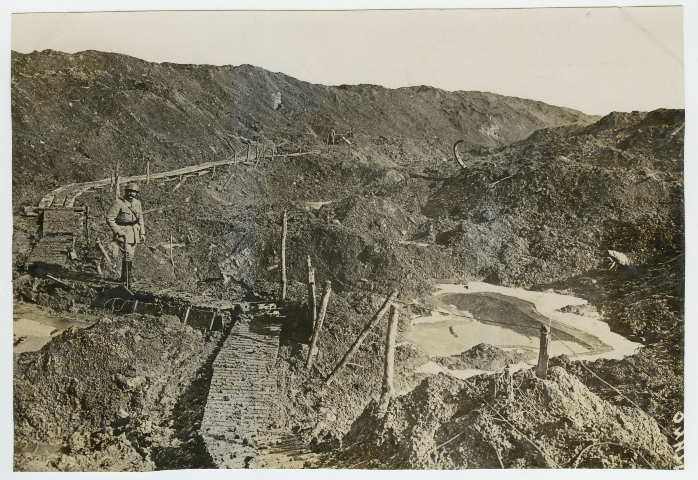 A French officer is standing on a wooden "duck-board" walkway circling below the rim of a large crater created by the explosion of an underground mine. This scene is in the vicinity of Fort Douaumont near Verdun, France. The scenery is desolate and a small lake fringed with ice lies below at the bottom of the crater.Photograph Details