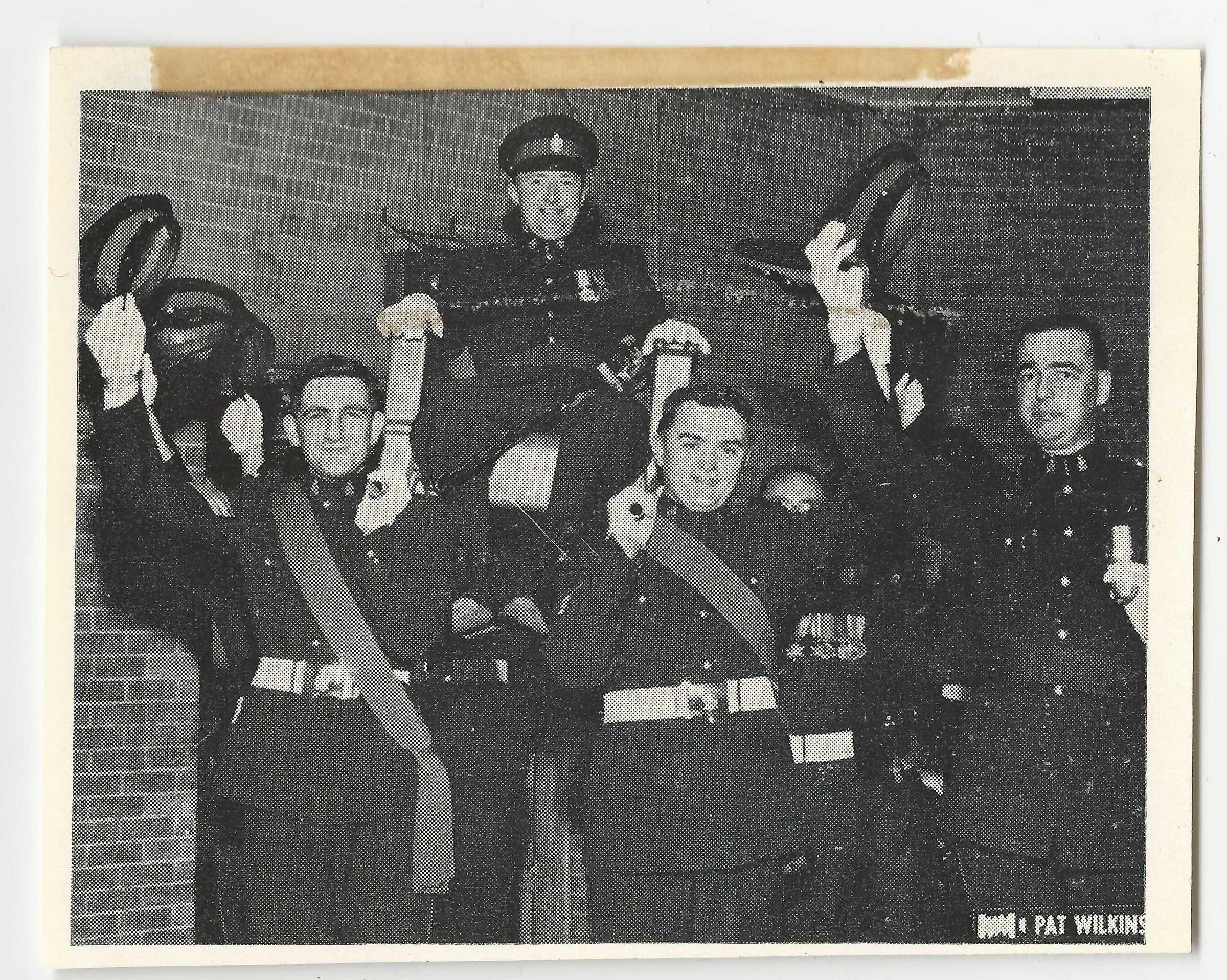 A black and white photo taken at the end of the term of Regimental Sergeant Major Robert A. Wheaton in 1967. His successor, Regimental Sergeant Major Douglas Newcombe on the right of the photograph is wearing the RSMs uniform and is holding the RSMs Malacca Cane under his left arm.Photograph Details
