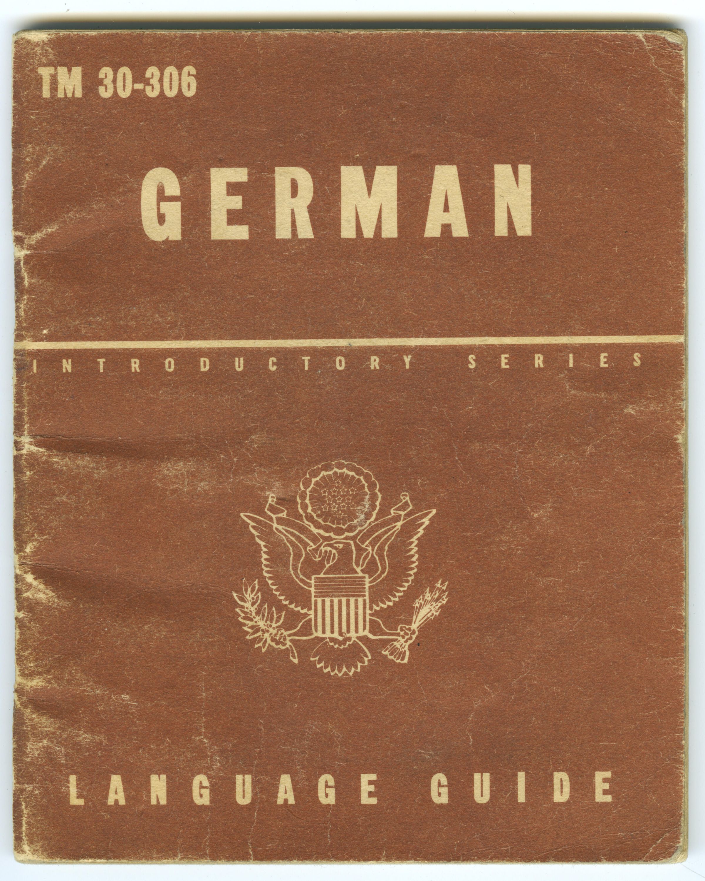 Produced and issued by the United States War Department, dated "June 24, 1943", published by order of the Secretary of War: G. C. Marshall. This was a basic guide to German, for American servicemen fighting in Europe during the Second World War. It is illustrated with cartoon GIs, and filled with common situational words and phrases.