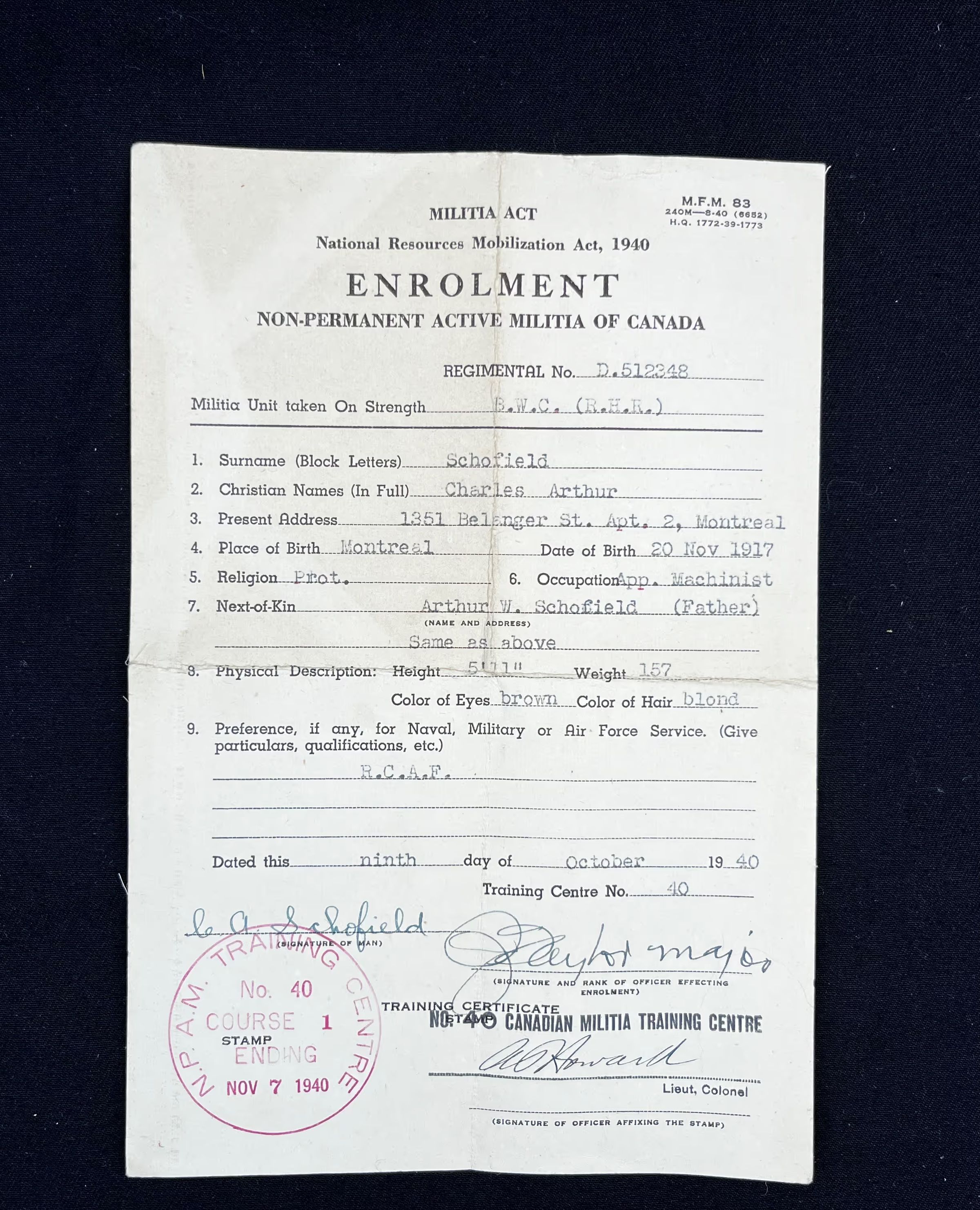 Enrolment form for Non-permanent Active Milita of Canada. Filled out via typewriter with Charles Arthur Schofield's information. Contains all the basic personal information needed for enlistment. The letter is dated 9 Oct. 1940.Subject