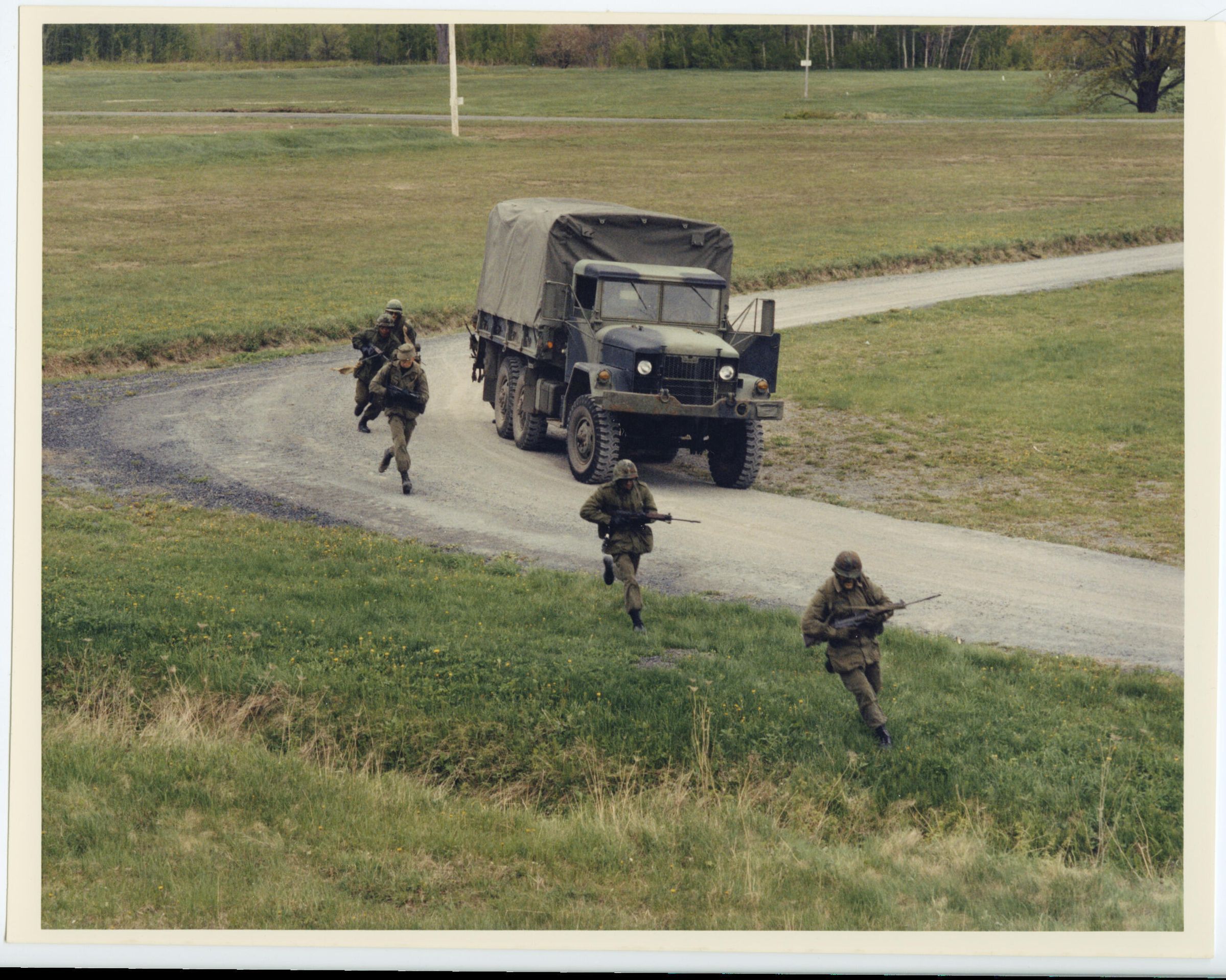 Five Royal Montreal Regiment soldiers on an exercise at the Mt. St. Bruno Ranges. They are moving next to an M35 MLVW Truck and carrying FNC1A1 Rifles, Sterling C1 SMG.Photograph Details