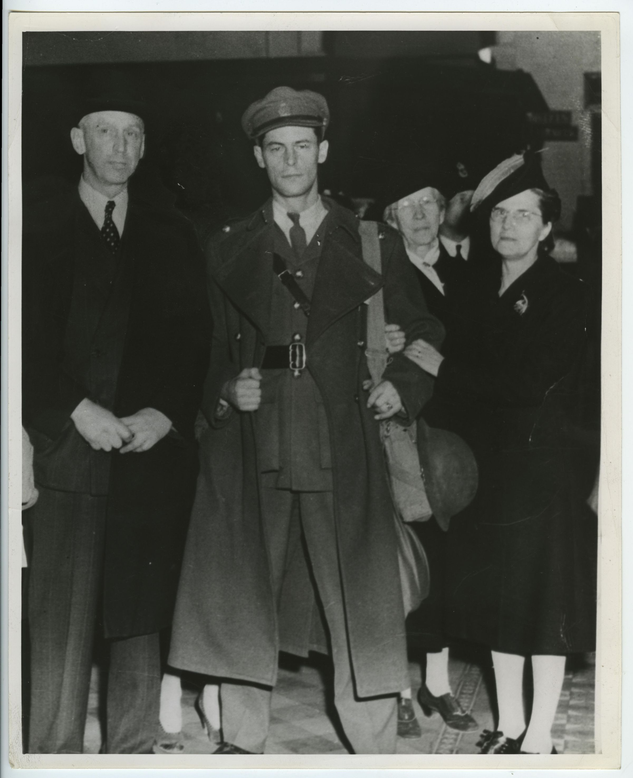 In the middle Lieutenant J. V. Owen is standing in uniform. On his left is his father and on his right, his mother dressed in black. More relatives are behind. On the verso, is a newspaper clipping. This is a scene of a family reunion after being separated for two years.Photograph Details