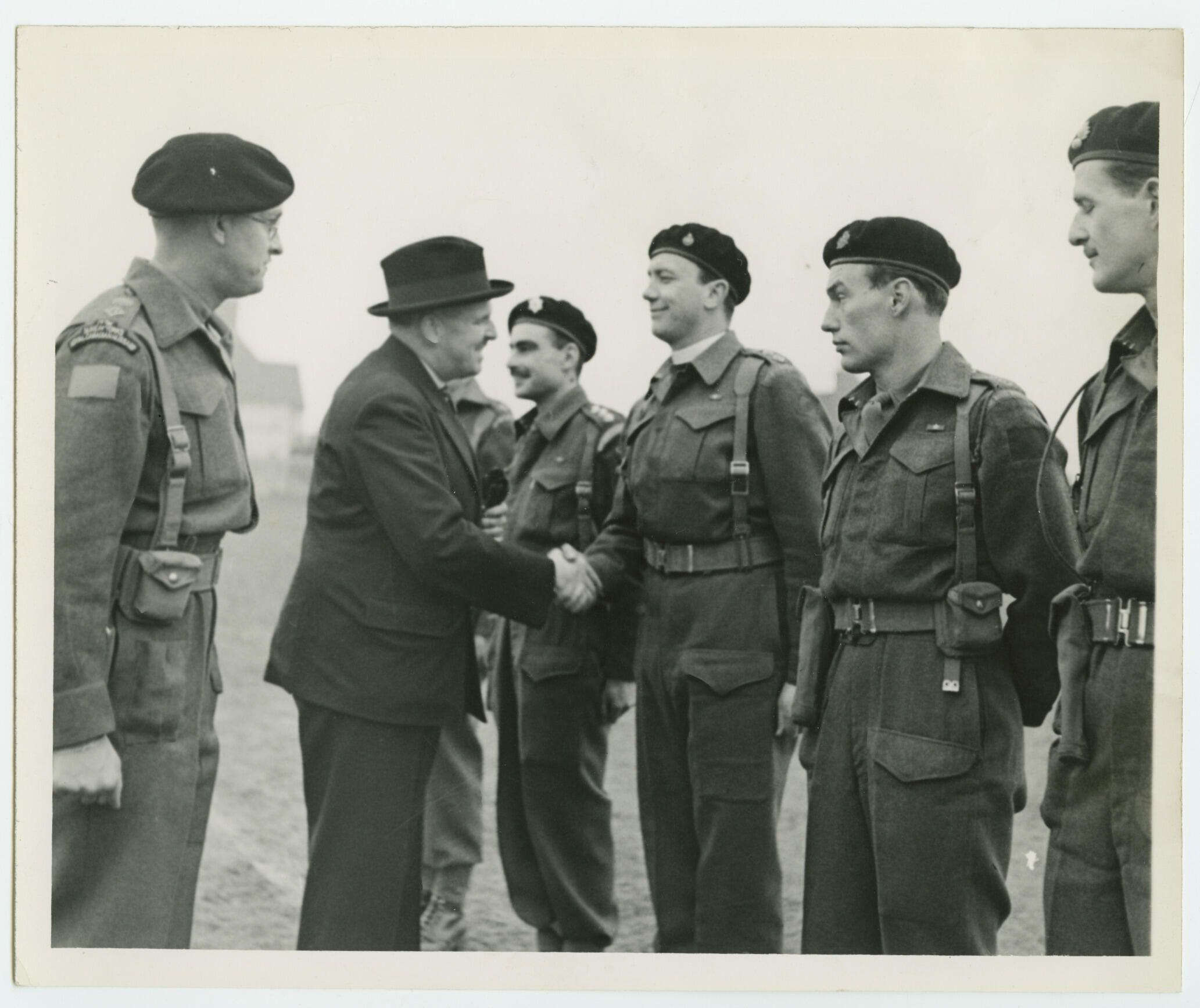 A photograph of Lieutenant Colonel Thomas C. Lewis and Major-General C. Basil Price, in civilian clothes, sharing farewells with Officers of the 32nd Canadian Recce Regiment (1st Battalion Royal Montreal Regiment) when that Regiment paraded for the last time upon its disbandment. The parade took place in the grounds of Seaford School, Sussex, at 11:15 hrs on March 18, 1944.Photograph Details