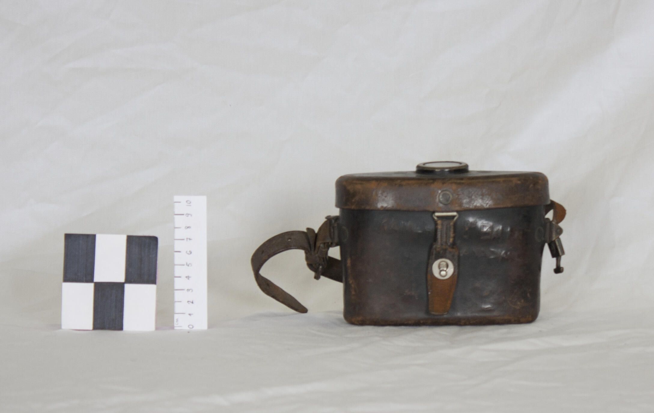 Leather case made to carry field glasses. A leather carrying strap is attached to it and a spring tensioned metal hook on the front holds the lid closed. A compass has been incorporated into the top of the case.Made/Created