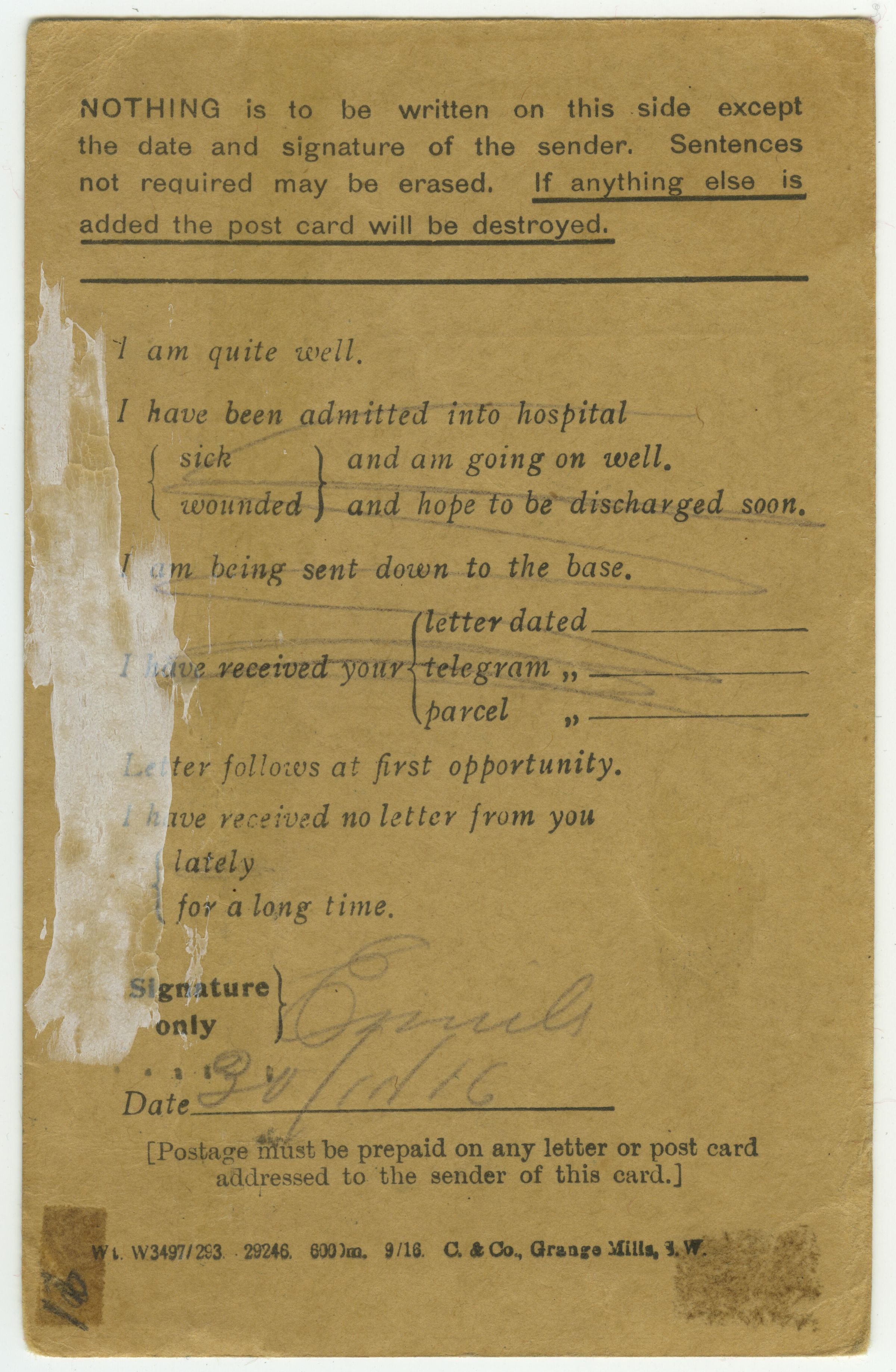 This is a WWI Field Service Postcard sent from the front to Victoriaville, Quebec. The soldier was given a couple of options and would have to communicate, striking out those not applicable to himself. If more was written in the letter, it would be destroyed.Lexicon